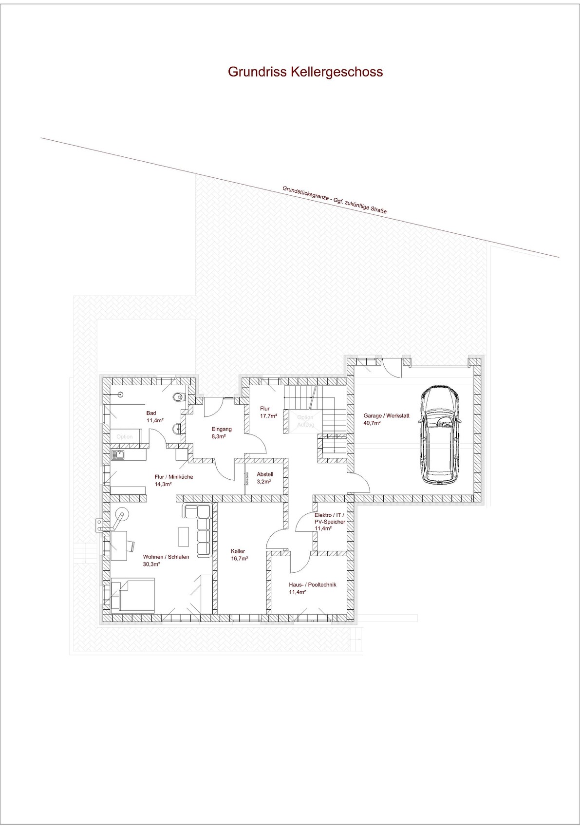 Unsere Kinder und Gäste kommen gerne zu Besuch, daher wollen wir im KG eine Gästewohnung einrichten, für das Alter haben wir unseren Entwurf so gestaltet das wir jederzeit durch kleinere Maßnahmen das EG barrierefrei ausbauen können, inkl. Aufzug bei Bedarf. Für den Fall der Fälle können wir die Gästewohnung auch für eine Pflegekraft zur Verfügung stellen, was hoffentlich nie erforderlich wird.