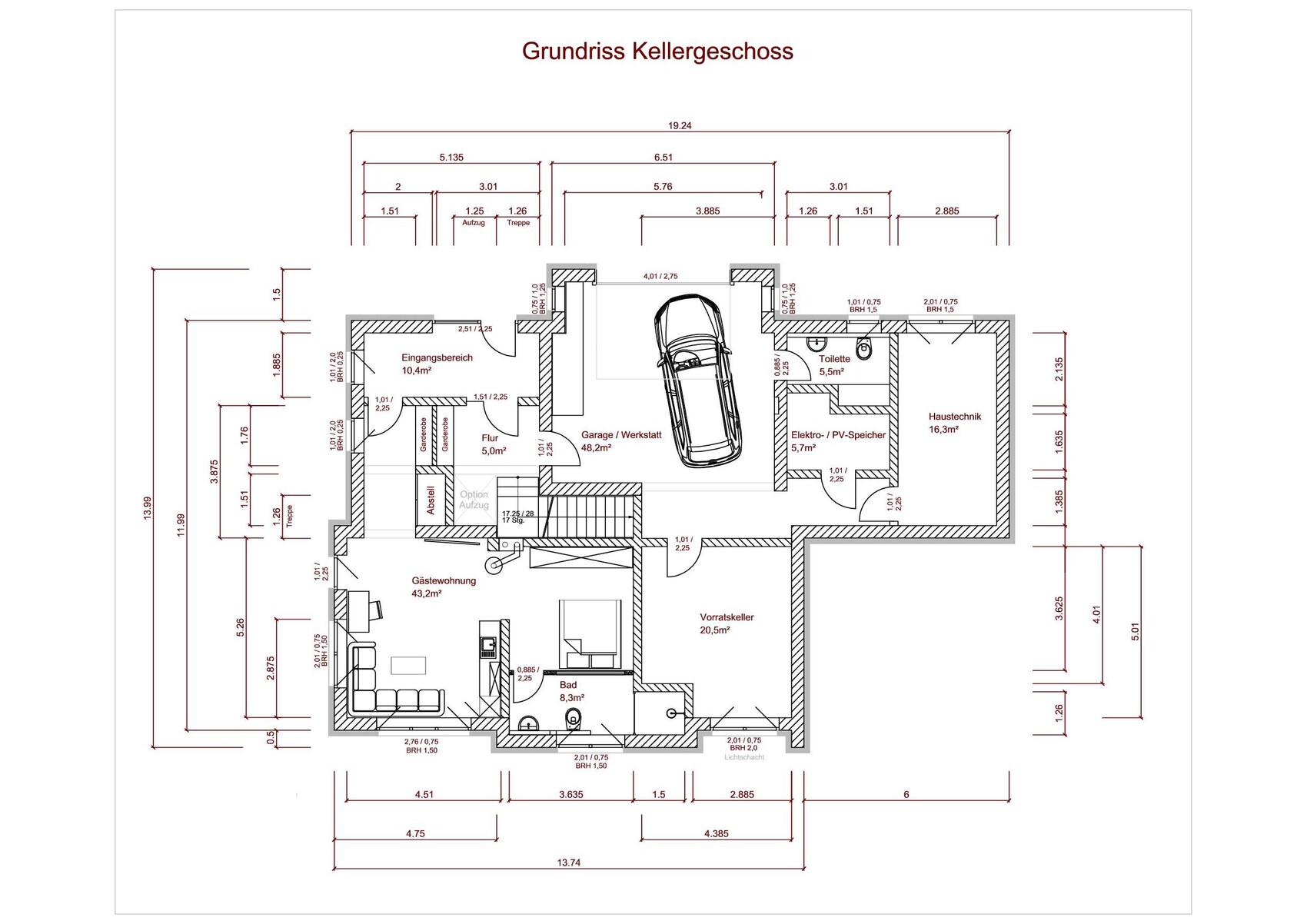 Grundriss Kellergeschoss: Garage/Werkstatt mit Auto, Gästewohnung, Vorratskeller, Bad, Haustechnik.