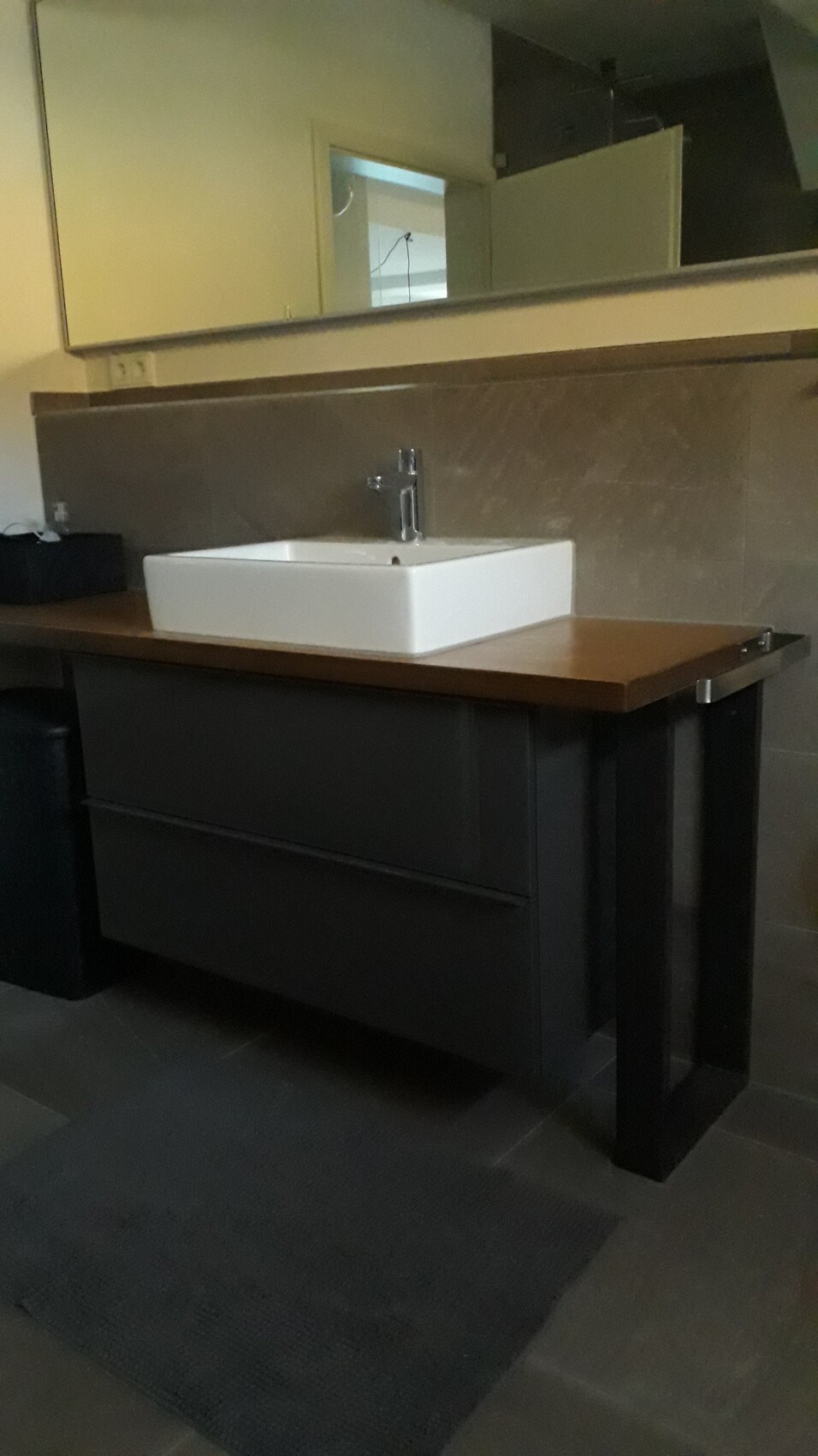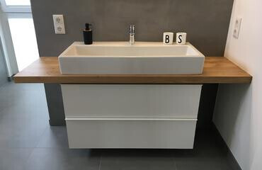Die Platten für auf die Waschtische von IKEA gefallen mir persönlich überhaupt nicht, aber da kann man ja im Grunde rauflegen was man will (Küchenarbeitsplatte, Holzplatte vom Schreiner / Zuschnitt, wir haben unsere auf eBay gekauft als Maßanfertigung). Oder man nimmt eines der Einbauwaschbecken von IKEA wenn man sich mit denen anfreunden kann.