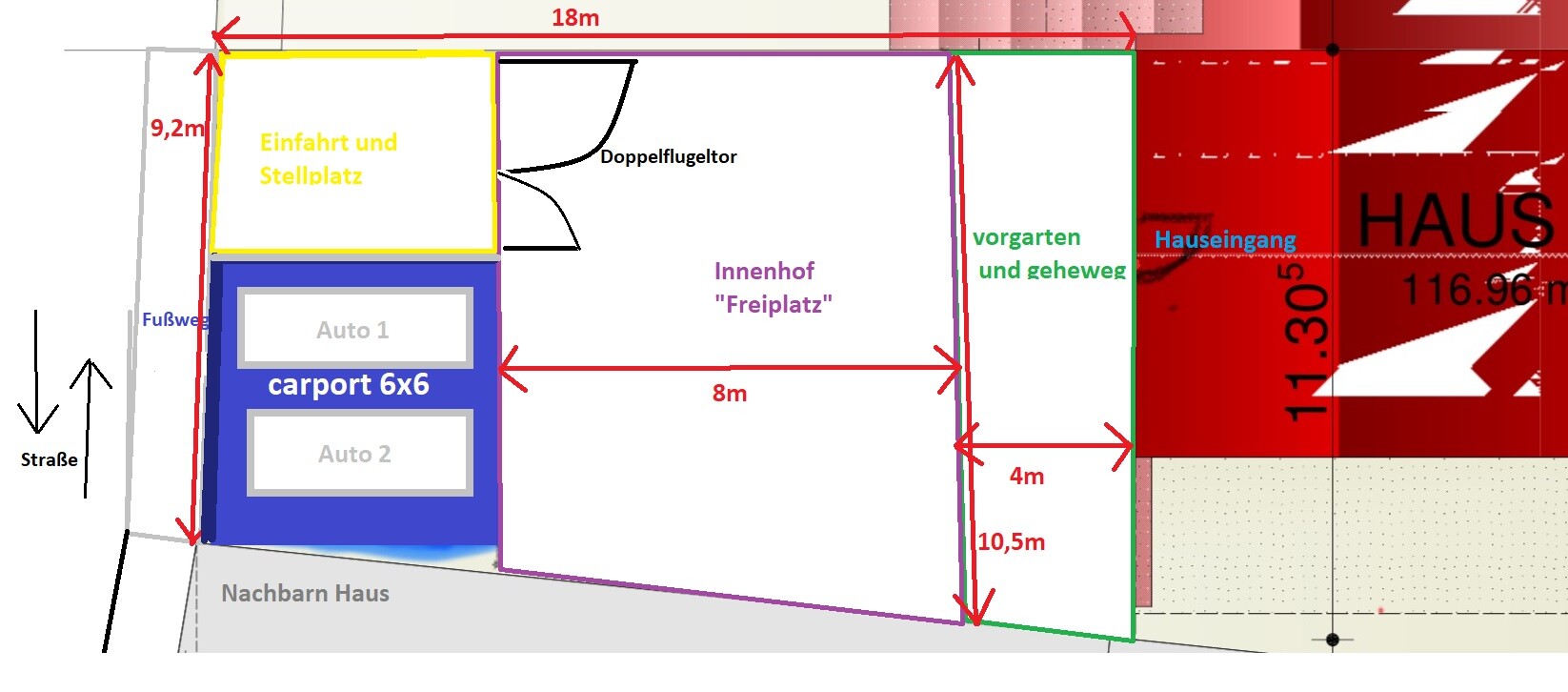 Unsere aktuell Idee ist die Carport direkt vor die Straße zu platzieren und eine Seite direkt and die Nachbarn wand. Von die 9,2m breite, 6m nimmt die Carport und mit die andere 3,2m könnten wir die Stellplatz haben. Das wäre auch die Einfahrt zu den Grundstück mit eine asymmetrische doppelflugeltor. So könnten wir von innen die Carport offen lassen und ein/aus Parken.
