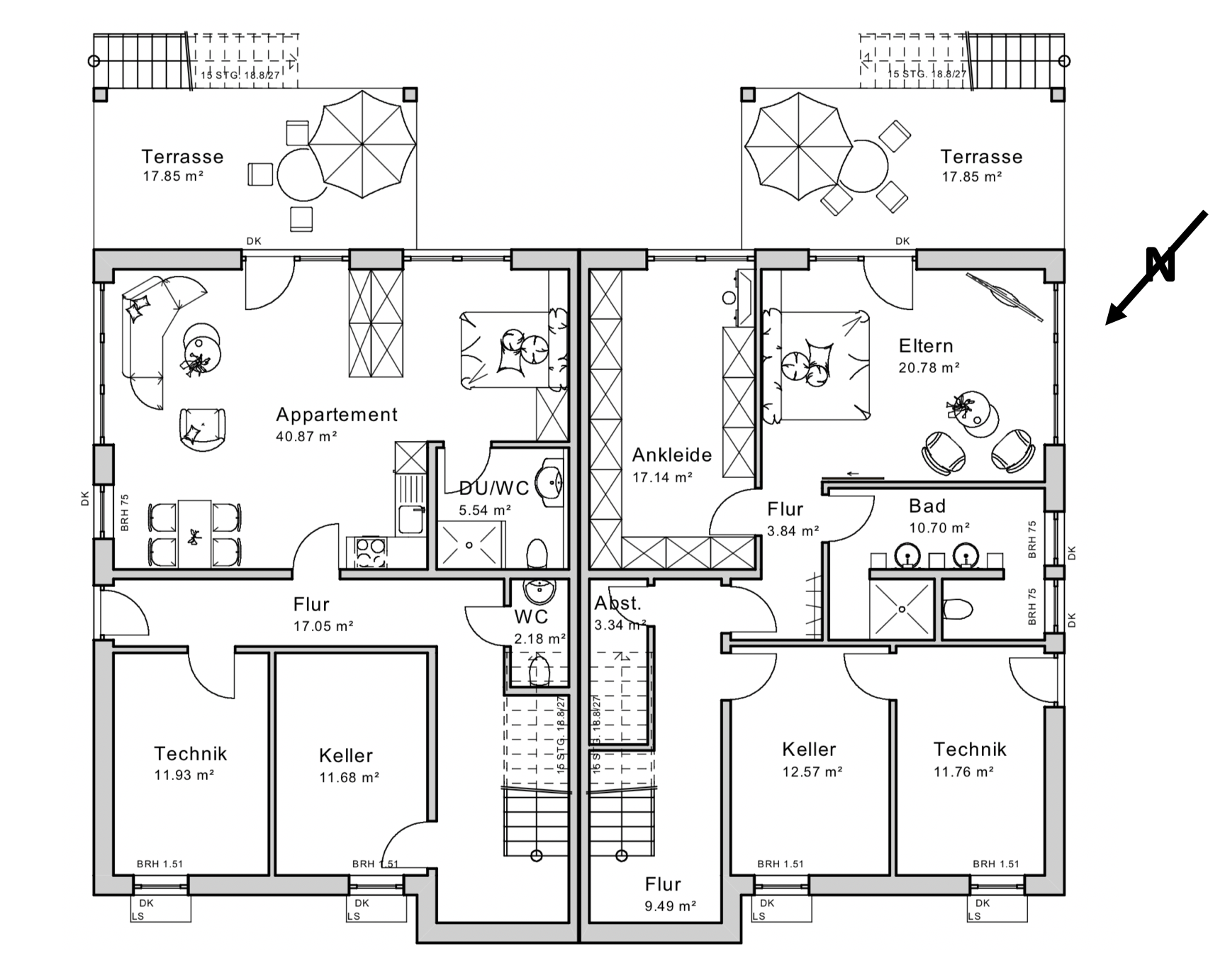 - Im Keller ist das Elternschlafzimmer mit Zugang zum Garten vorgesehen. Wenn Nachwuchs kommt, ist der Weg von KG ins OG zu weit, sodass auch die Eltern temporär im OG schlafen sollten.