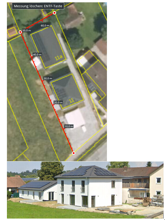 Etwas ähnliches gibts auf meinem Arbeitsweg. Grundstück ist ähnlich breit, aber länger. Es sind auch zwei Einzelhäuser, aber von der Einfahrt und Zuwegung ähnlich. Terrassen sind direkt bis an die Grenze gesetzt, keine Ahnung, wie das bei denen rechtlich aussieht. An der Einfahrt steht eine Fertig-Doppelgarage, daneben sind noch rechts und links jeweils ein Stellplatz und der Weg zu den Häusern.