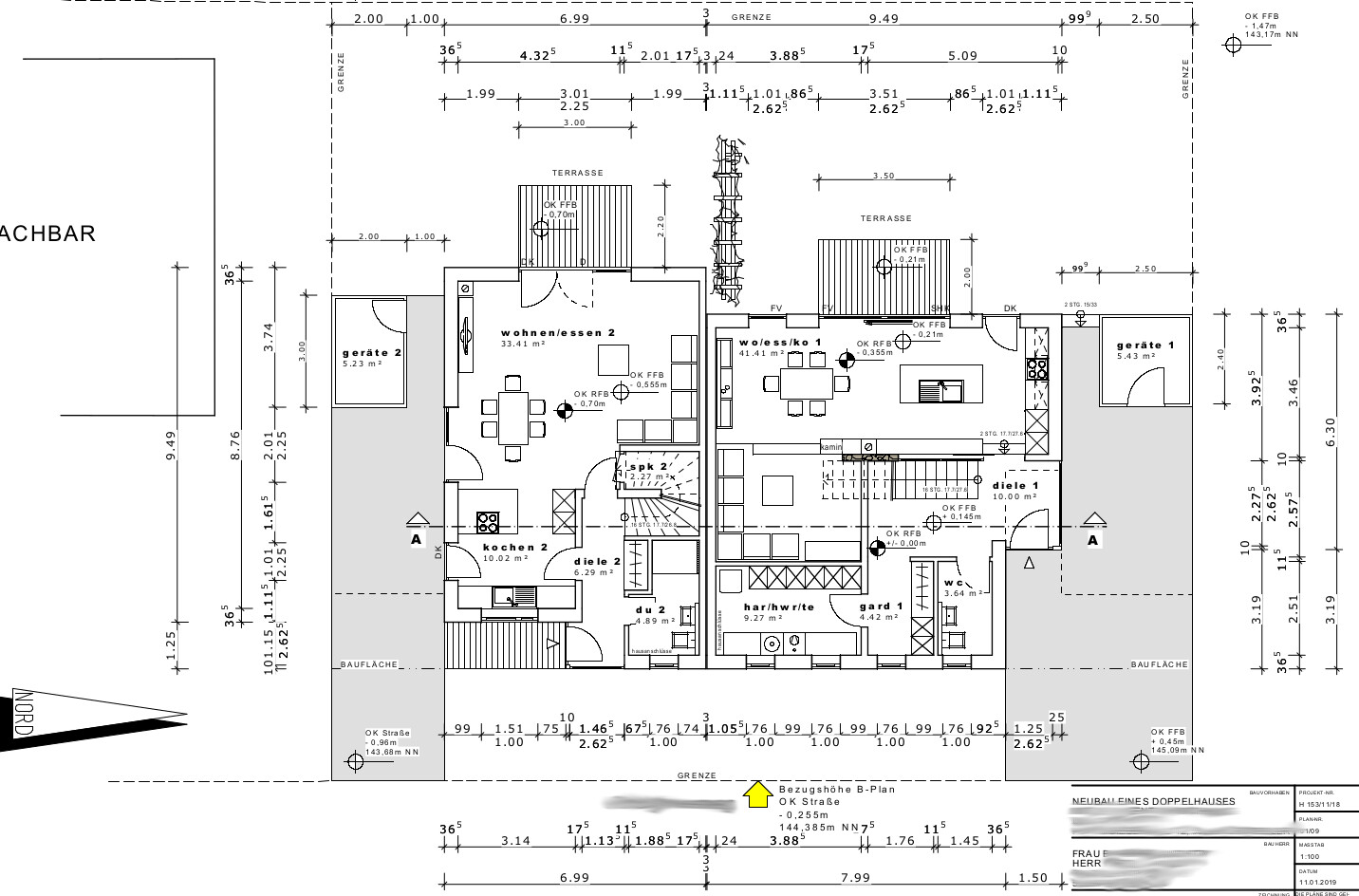 Nur kurz zu deinem "HAR nur von außen betretbar - wtf?": das muss so, weil die Technik auch für die andere Haushälfte ist. Nach § 5 Abs. 2 WEG dürfen Räume die der gemeinschaftlichen Nutzung dienen (wie eben Technikräume) kein Sondereigentum sein. Die Nachbarn müssen ja auch Zugriff haben, ohne immer darauf angewiesen zu sein, dass ihr da seid, ist ja schließlich auch ihre Technik. Ihr habt ja im OG noch einen Hauswirtschaftsraum.Nein, die Südhälfte hat einen eigenen Technikraum im DG, Hausanschlüsse dort sind im Gäste-WC. Die Haushälften werden separat angeschlossen, jede erhält eigene Heiztechnik etc. Größtmögliche Trennung ist uns extrem wichtig. Daher mein wtf...
