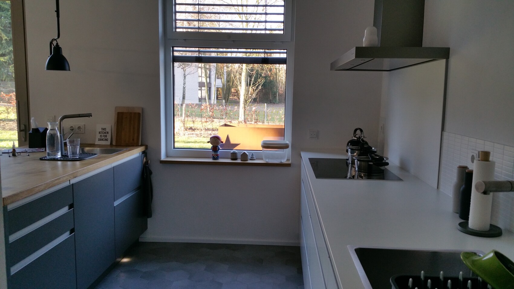 Anfangs hatten unsere Architekten tatsächlich eine Art "Klönfenster" vorgesehen, der untere Teil wäre dann schwenkbar gewesen. Das war mir dann aber doch too much. So ist der untere Teil feststehend und der obere zu kippen. Mit Lüftungsanlage und Dunstabzug hätten wir aus heutiger Sicht das Fenster komplett feststehend machen können aber nun gut.