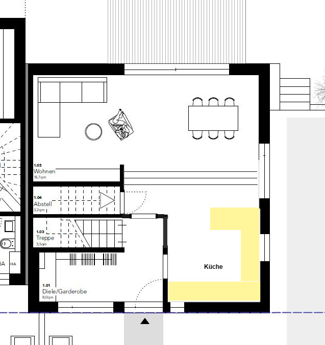Dass der Allraum im Entwurf nicht großzügig und offen ausgefallen ist, missfällt mir auch. Garderobenbereich und WC verschwenden Platz. Da müssen wir noch mal ran.