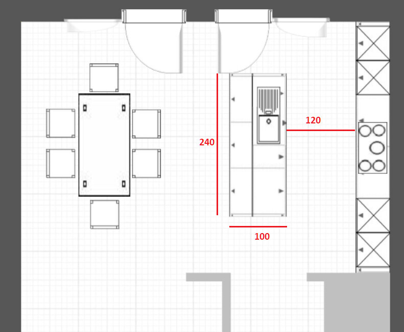 Die Küche passt wunderbar, ebenso der Esstisch. Im Beispiel ist der Tisch 90 x 180cm groß, ein größerer Tisch passt auch.