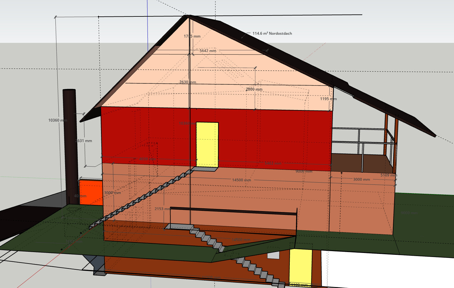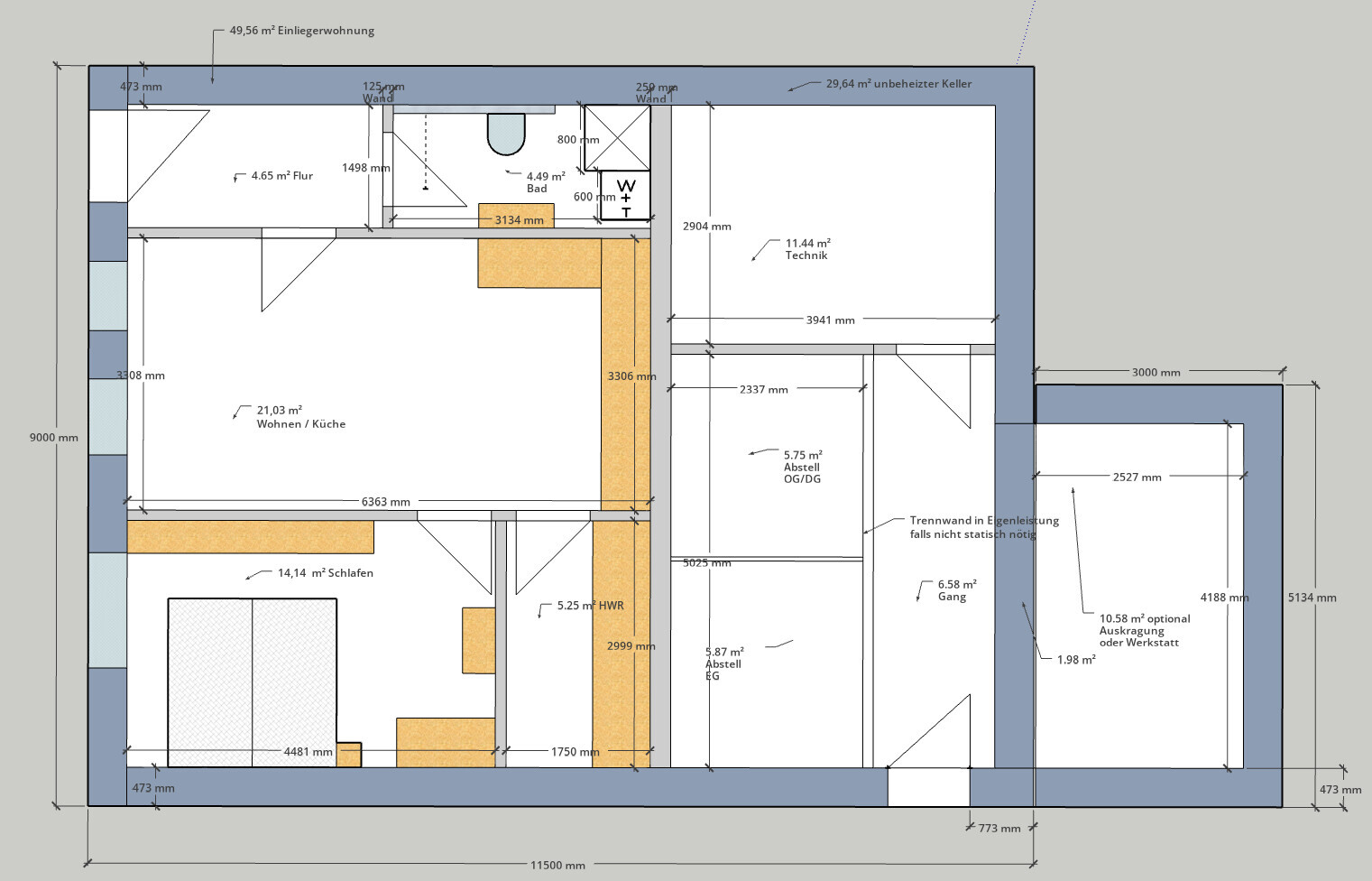 - im Grundriss habe ich die mit 473 mm recht dicken Außenwände meines Passivhauses eingezeichnet, dünner und dem zufolge größere Räume ist ja immer einfacher, wie umgekehrt