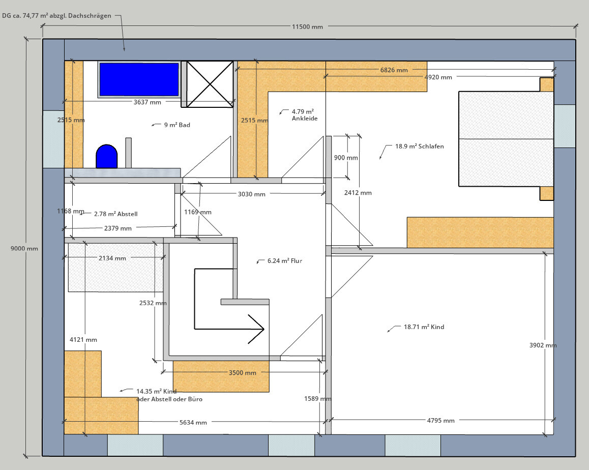 Ich habe versucht, die Flächen möglichst gut auszunutzen, auch wenn mich die beiden L-förmigen Zimmer im OG/DG geringfügig stören (andererseits sah mein Kinderzimmer ähnlich aus).