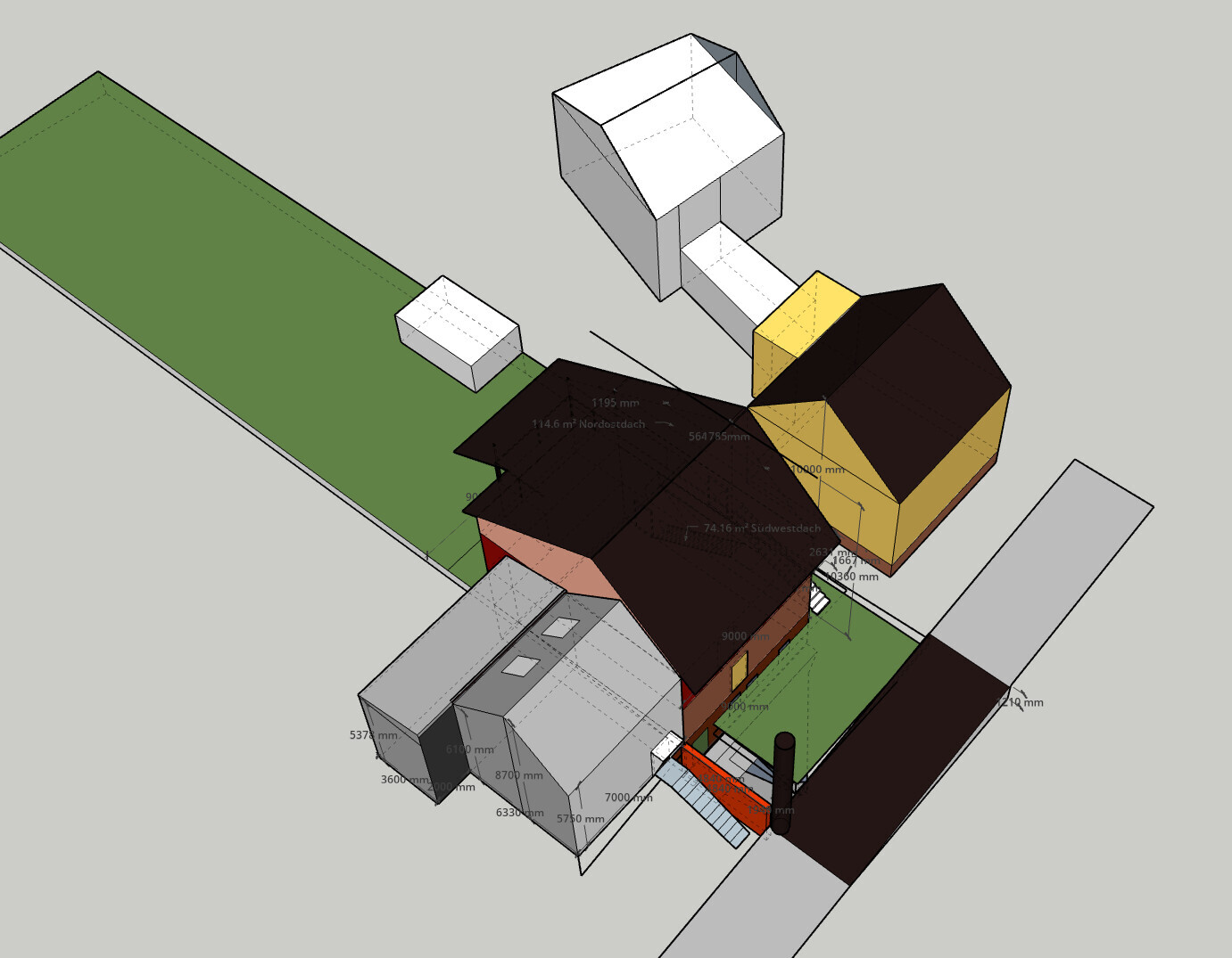 - insbesondere muss ich mich beim Dachwinkel an der Straßenseite nach dem Nachbarhaus richten (also ca. 41°), kann das Dach aber auch höher machen und das Haus wie zuvor 1,5 m länger / tiefer als das des Nachbarn machen (es gibt in unmittelbarer Nachbarschaft ähnliche Beispiele, hab auch schon mit dem zuständigen Bearbeiter der Baubehörde die Pläne gezeigt und er sah keine Probleme)