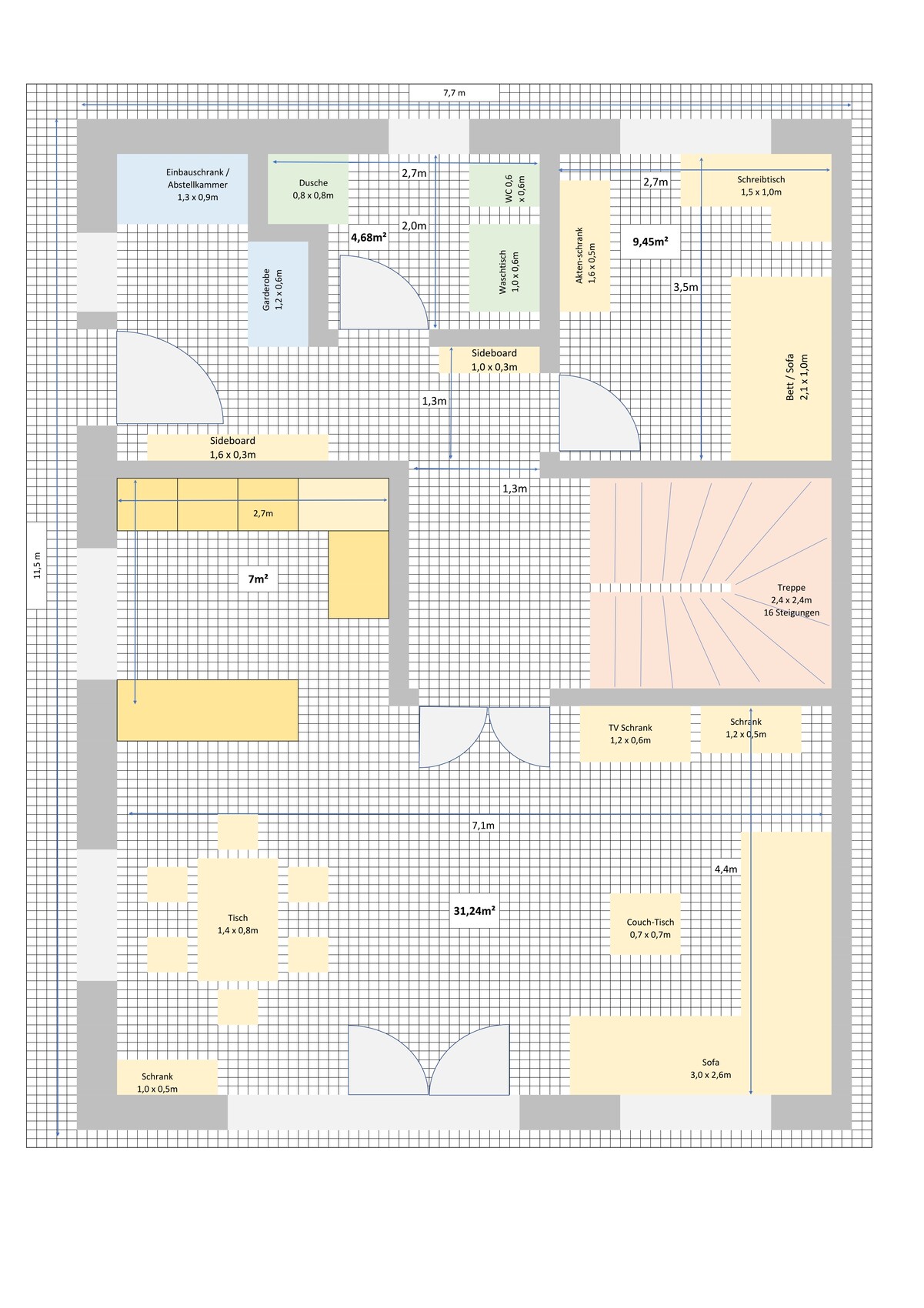 Ypg's Vorschlag für das Untergeschoss ist interessant und modern gestaltet. Mir persönlich bietet er zu wenig Stellfläche für meine existierenden Möbel im Wohnzimmer/Essbereich.Bei meinem sind mehr Stellwände gemessen als Dein Plan.