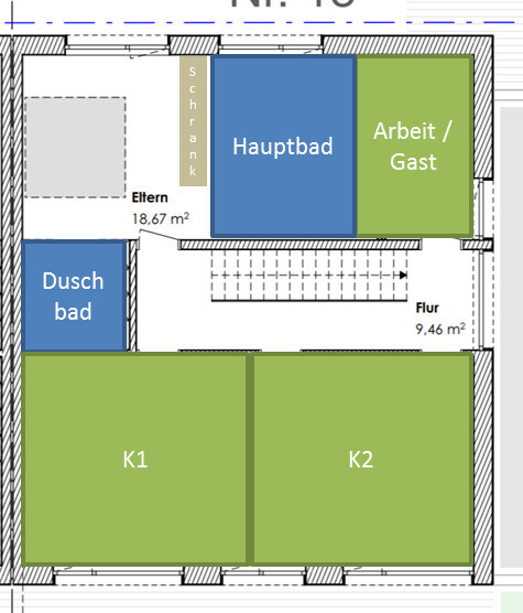 Noch als Alternative mit großen Kinderzimmer und kleinem Gast/Arbeiten zu Lasten der Ankleide: