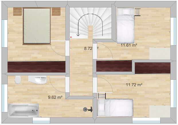 Bei dem kleinen Haus würde ich der Treppe Max. 2,20m gönnen - eher nur 2m. Das ist zwar wirklich schmal, aber es ist auch echt ein kleines Haus! Dann würde auch der Abstellraum/Dusche und das Schlafzimmer größer...