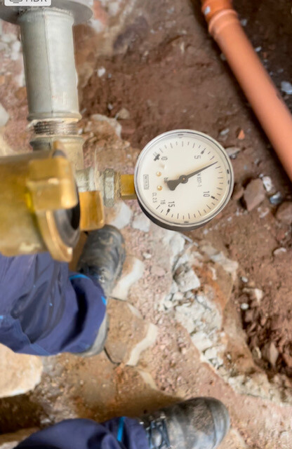 Druckmessgerät an Rohrverbindung bei Bauarbeiten; Bauarbeiter mit Stiefeln im Erdreich.
