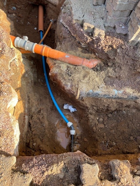 Baugrube mit orangefarbener Hauptleitung und blauer Zuleitung, Schlamm und Wasser.