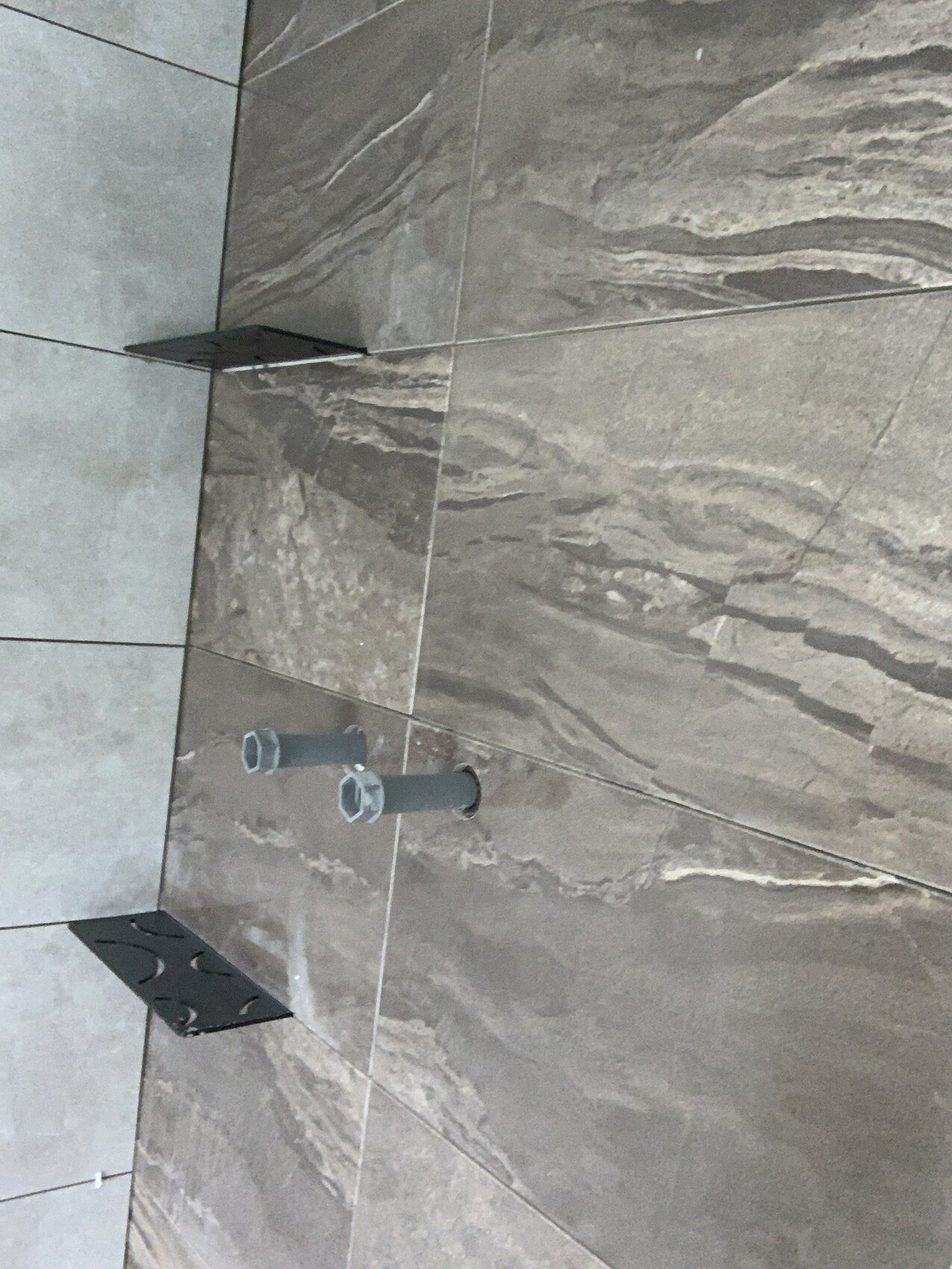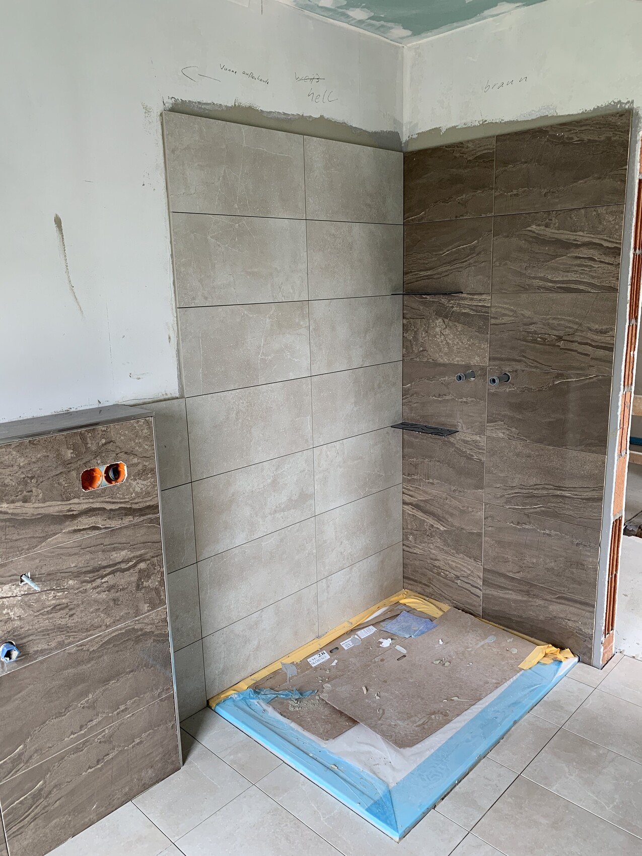 Für unser Haupt-Bad haben wir in der Dusche auch eine Ablage gelassen. In die Gäste-Dusche kommt ein Hans-Grohe Showertablet. Damit hat man Armatur und Ablage gleichzeitig erschlagen.