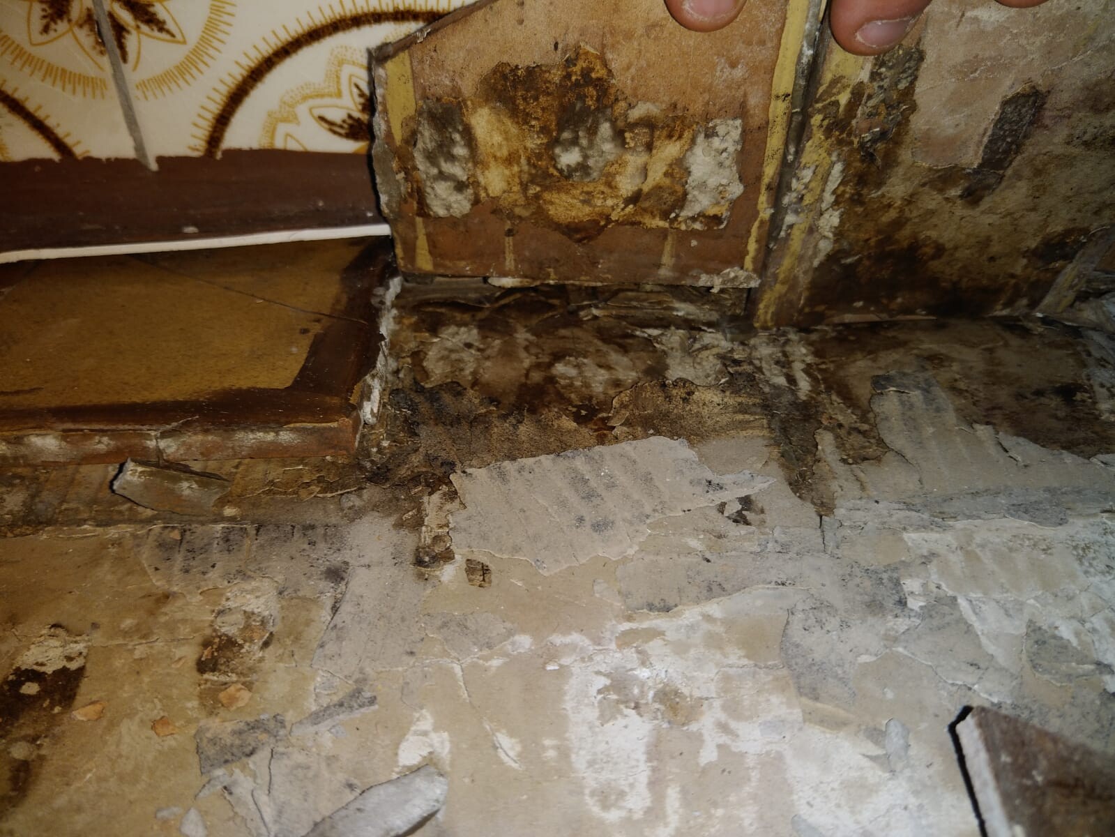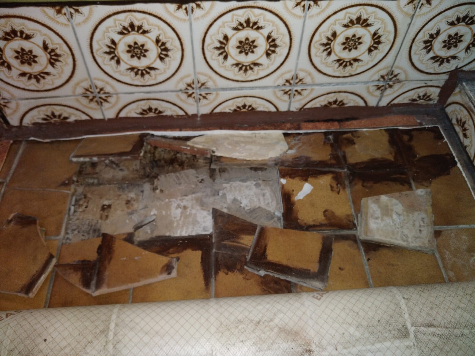 Wir haben vor der Dusche den PVC-Belag und die darunter liegenden Fliesen entfernt. Leider lässt sich keine wirkliche Ursache für das Einsinken des Bodens erkennen.