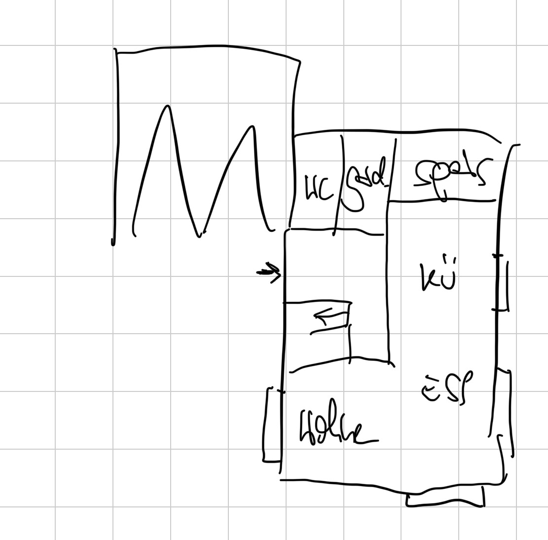 Handgezeichneter Grundriss: linke Großfläche, rechts Küche, Speisebereich und WC.