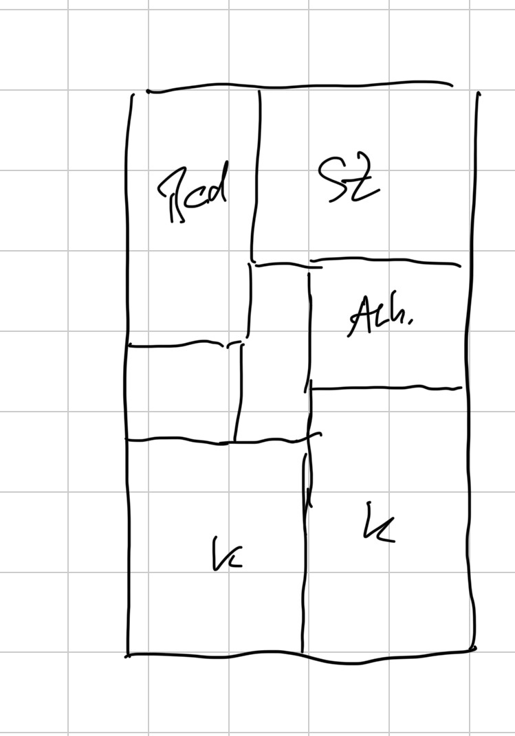 Handskizze eines Grundrisses: Rechteck in Felder mit Beschriftungen Päd, Sz, ACh, K.