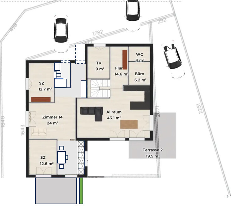 Die Terrasse geht auch gut getrennt. Der kleine Vorsprung vom OG eventuell als Eingangsüberdachung? Der Flur in der Mitte ist aber vermutlich besser. Falls Du das visualisierst würde ich gern die Variante sehen.