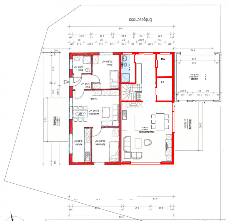 Das Grundstück ist kompliziert,Ist es gar nicht. Ich sehe die Komplikationen eher in einer zu großen Einliegerwohnung. Der Allraum ist fast genauso groß wie der der Familie. Die Küche ist besser zu möblieren, sogar ein Gästezimmer hat Platz. Ja, auch eine Seniorin möchte genug Fläche bewohnen, allerdings muss man sich im Klaren sein, dass das Grundstück von u600qm Grenzen aufweist und wahrscheinlich nicht alle Wünsche respektieren kann.Hausmma schrieb: