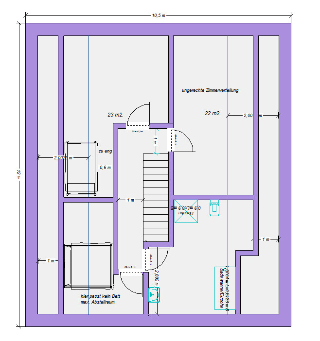 Wie Du siehst, geht da nichts mehr mit Schlafzimmer. Schon das Kinderbett im planlinken Zimmer ist kaum mehr möglich bei 1m Drempel, weil man auf 60cm nicht mehr daneben stehen kann, ohne die Luft anzuhalten. Und da hab ich nur einen 1m Flur oben - das ist schon unter der Kotzgrenze.