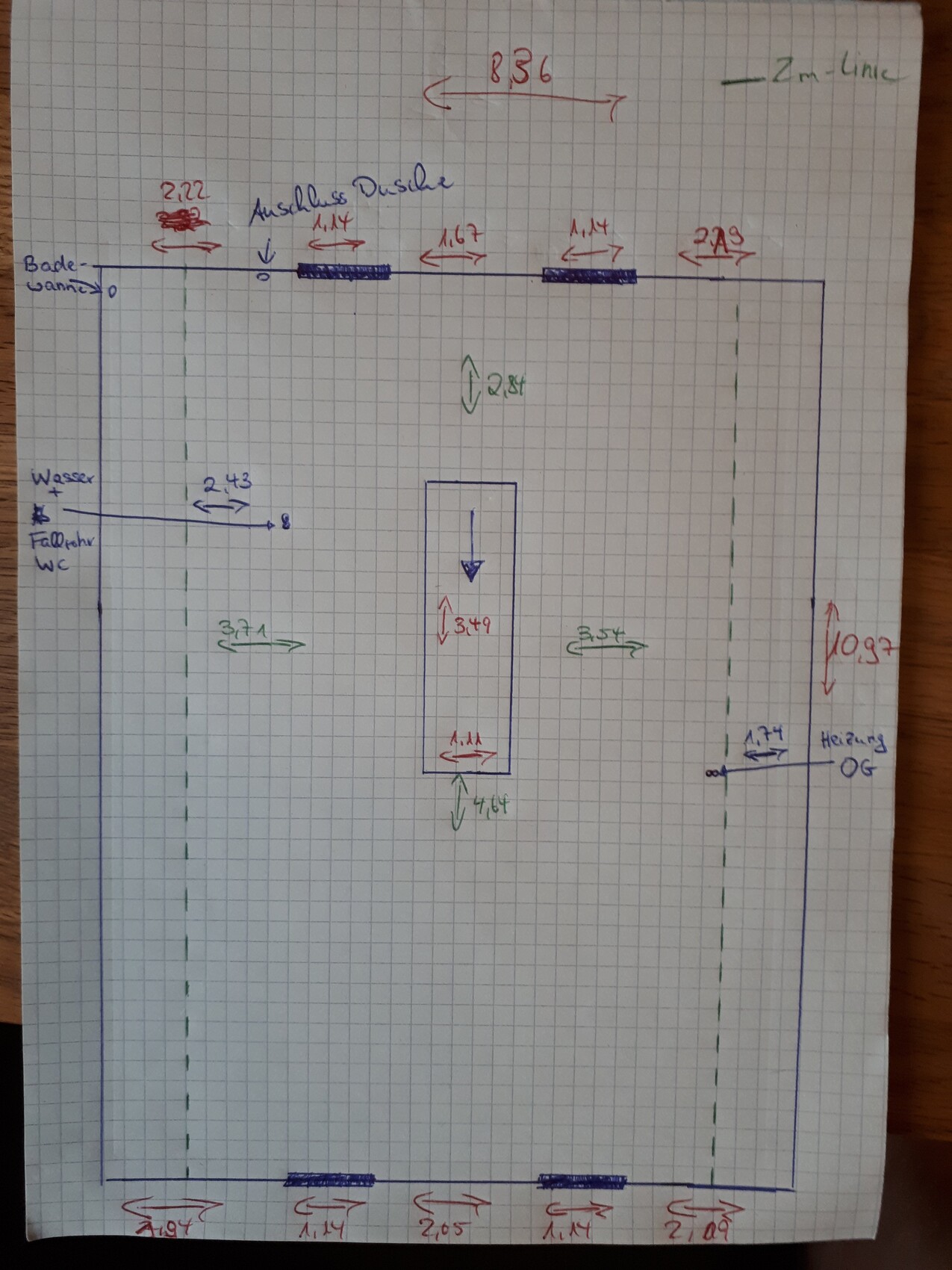 Das ist jetzt meine Zeichnung mit allen von mir ermittelten Maßen. 10 cm Fußbodenaufbau und Rigips an der Wand wurden berücksichtigt.