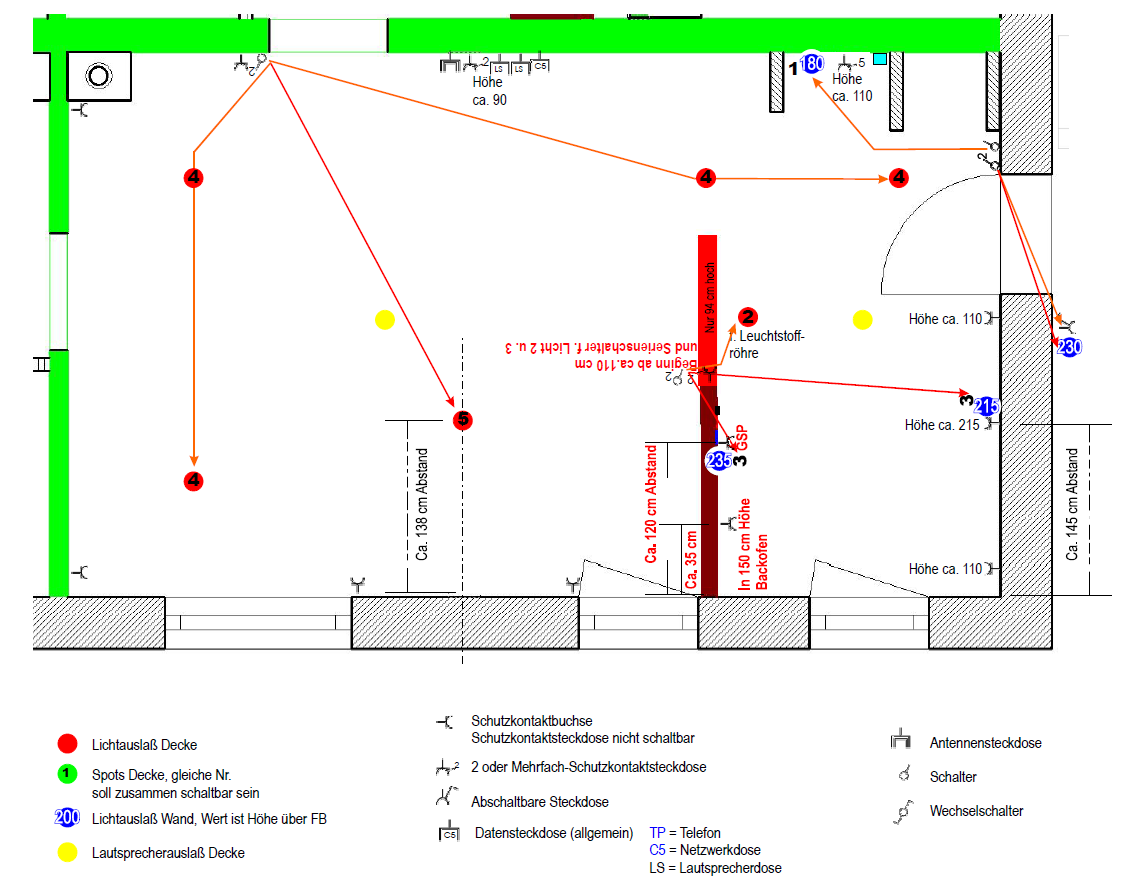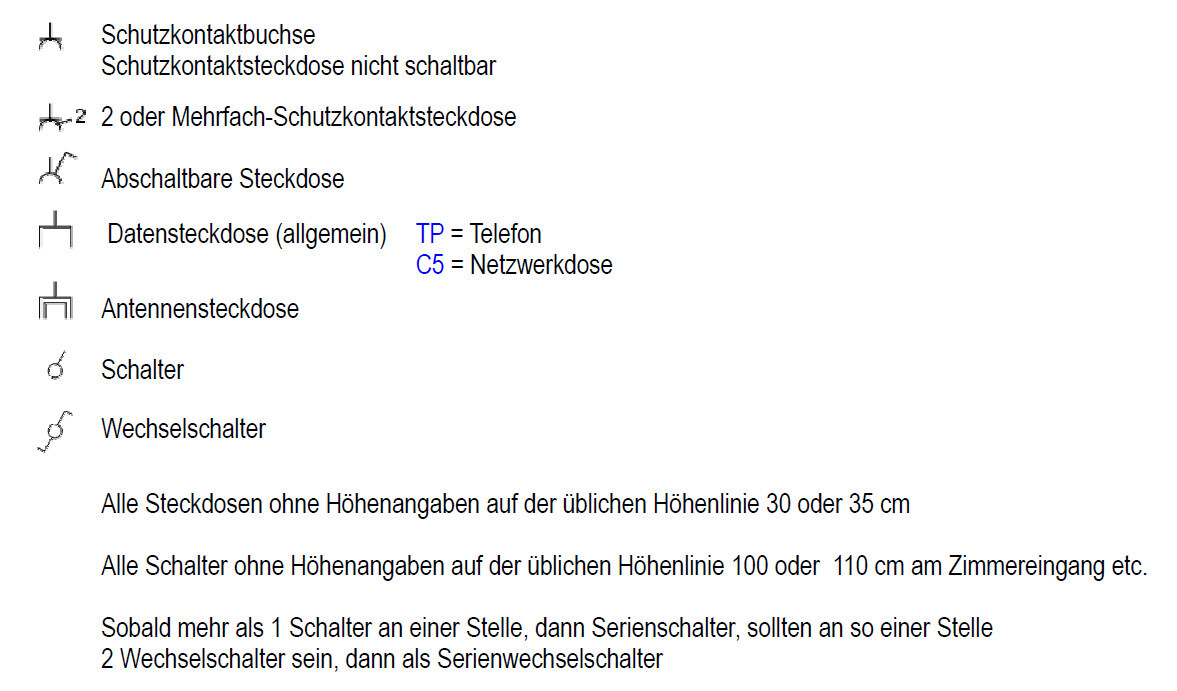 Ich habe das damals Raum für Raum gemacht mit CorelDraw . Schalter/Auslass-Positionen, die sich nicht automatisch ergeben haben, wie Schalter neben der Tür oder wo es mir wichtig war, dass sie an genauer Stelle sitzen, habe ich auch extra vermaßt. Leider darf ein PDF wohl nicht mehr hochgeladen werden, daher hier mal Vorspann und Wohnzimmer als Beispiel:
