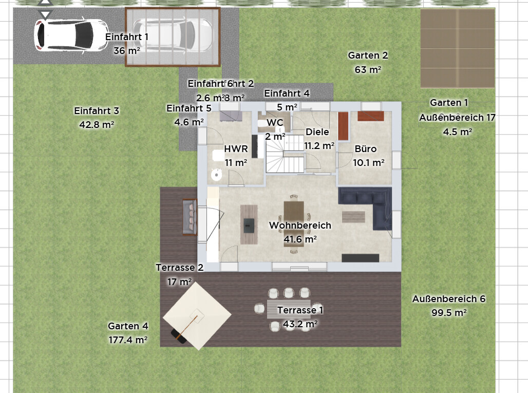 Übersichtlicher Grundriss eines Hauses mit Garten, Terrassen und Zufahrt von oben