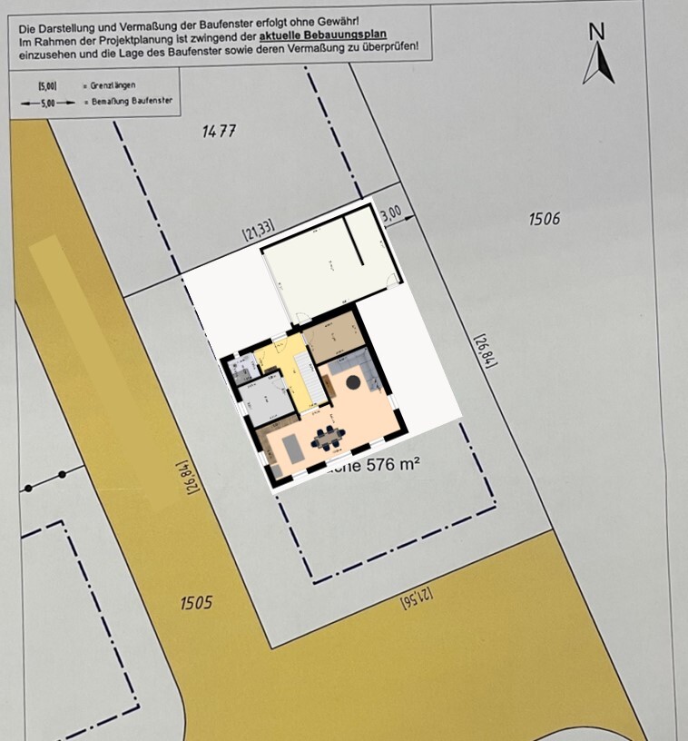 Euer Haus steht sehr weit weg von der Straße, dürft ihr die Terrasse außerhalb des Bebauungsfensters machen? Und wollt ihr wirklich nur nen schmalen Streifen hinterm Haus und 10, 15m Vorgarten?