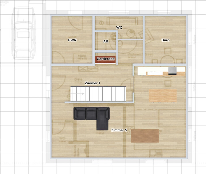 Grundriss eines Hauses: HWR, AB, WC, Garderobe, Büro; Zimmer 1 & 5 mit Sofa und Tisch.
