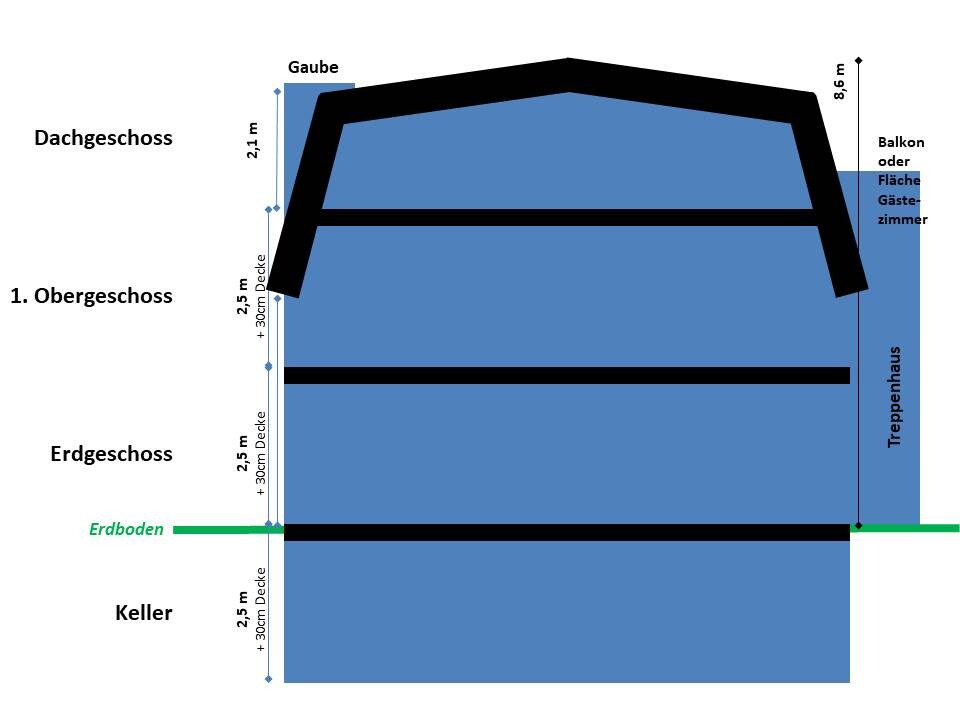 Querschnitt: Keller, Erdgeschoss, Dachgeschoss, Treppenhaus, Gaube, Balkon