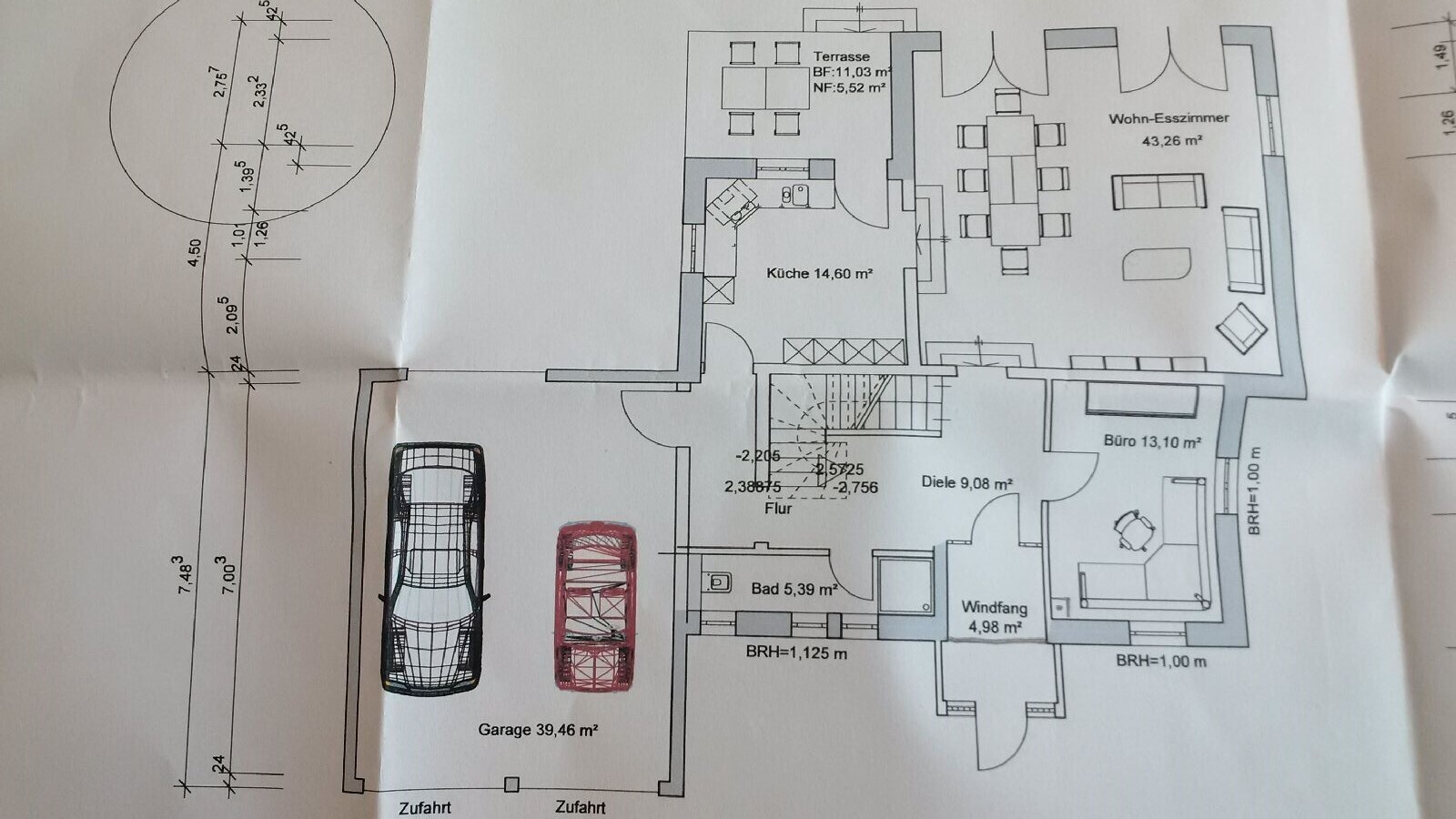 Das Gäste-WC ist 1,00m breit. Optional könnten wir noch auf 1,10m gehen, ansonsten wird es zu eng im Flur.