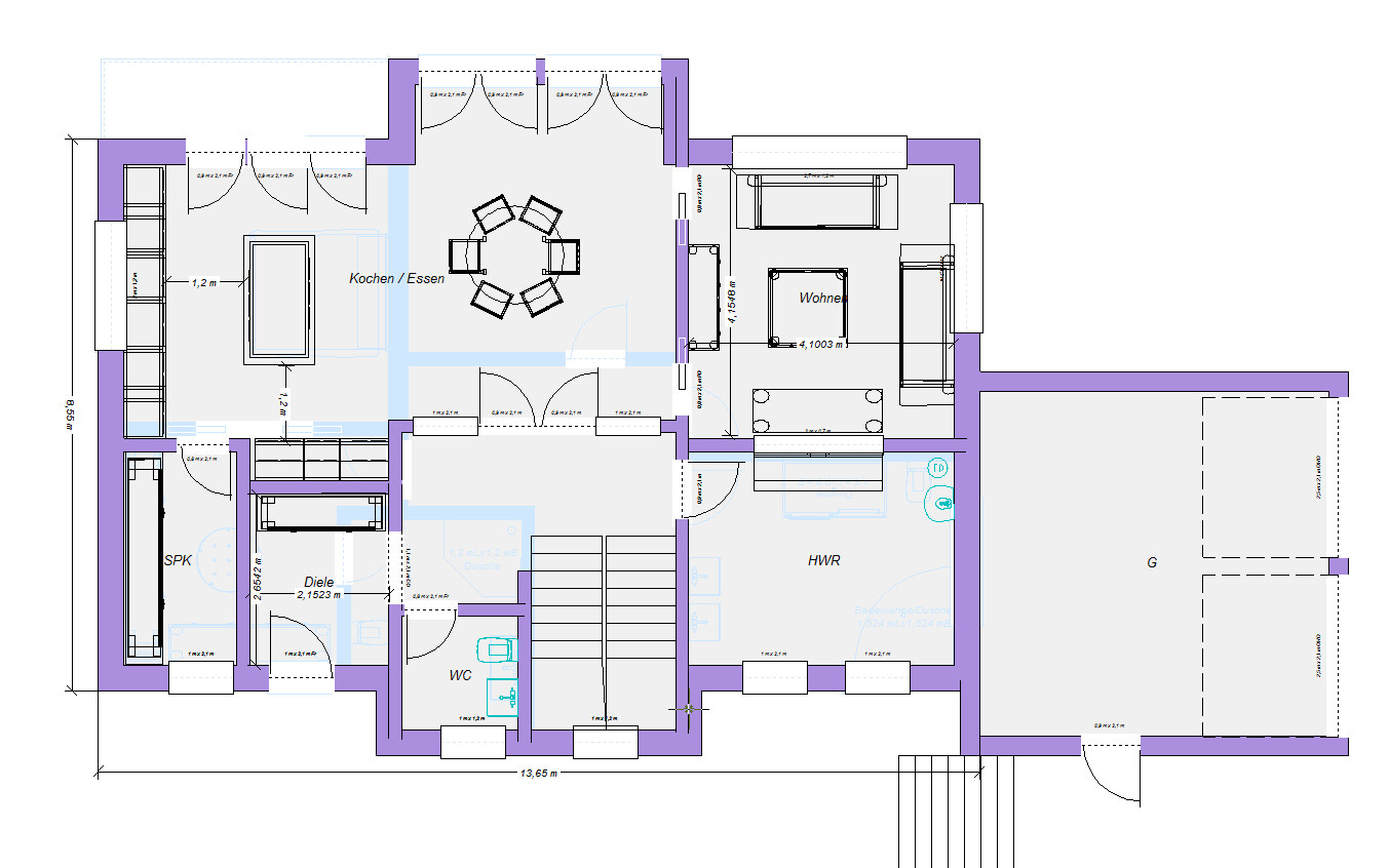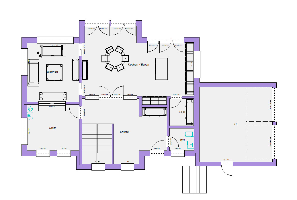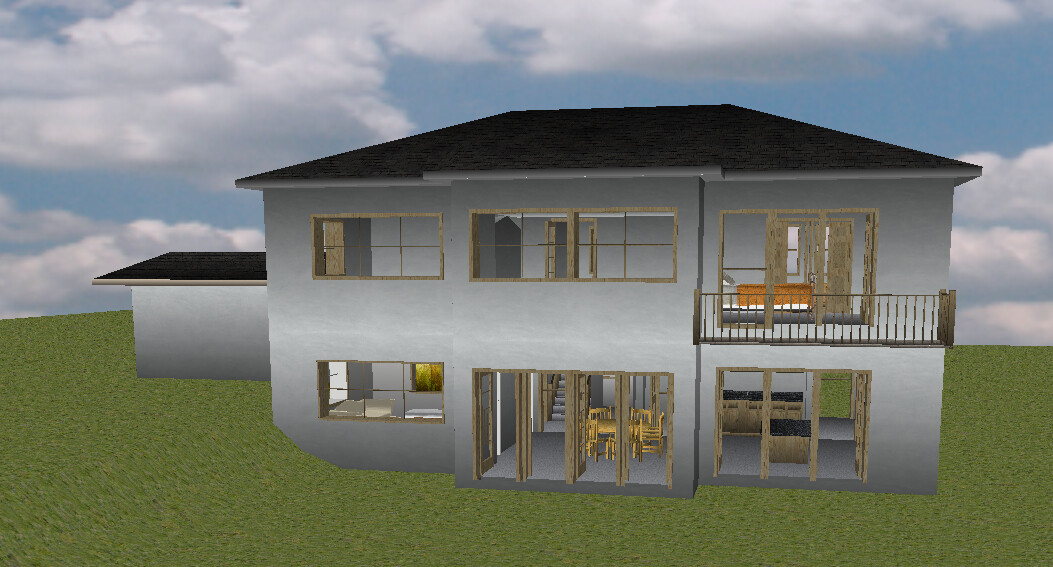 Abends vom Wohnzimmer aus, kann man den Ausblick auch genießen.Man könnte natürlich alles spiegeln, damit das Bett im Osten steht:Aber dann trottelt man am ganzen Haus vorbei bis zum Eingang und die Garage nach unten holen find ich auch blöd.