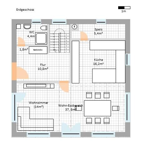 Auch mal überlegen, ob es nicht sinnvoller ist, die Terrasse und den Ausgang von der Küche aus erreichbar zu machen und nicht durch eine Chillecke. Auch ist die Chillecke nicht zum chillen geeignet, wenn jeder Hans und Franz da durch muss, um sich ein Glas Milch zu holen.