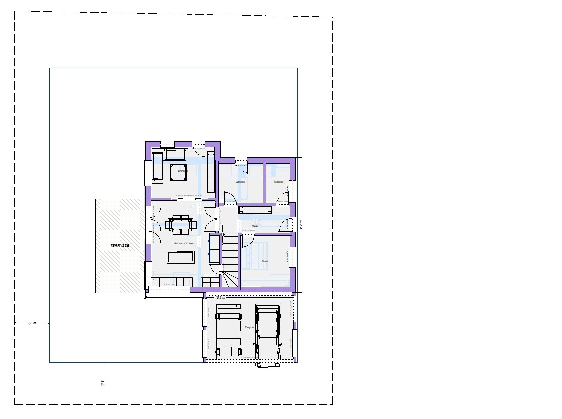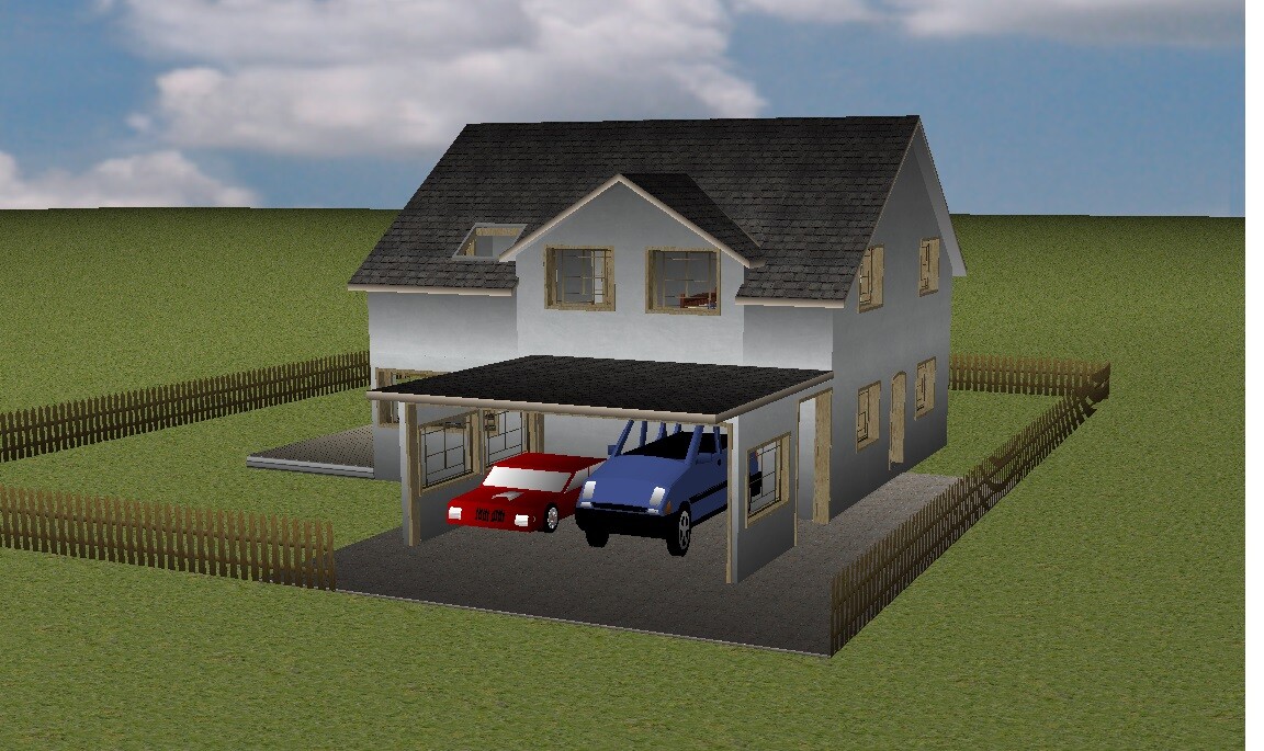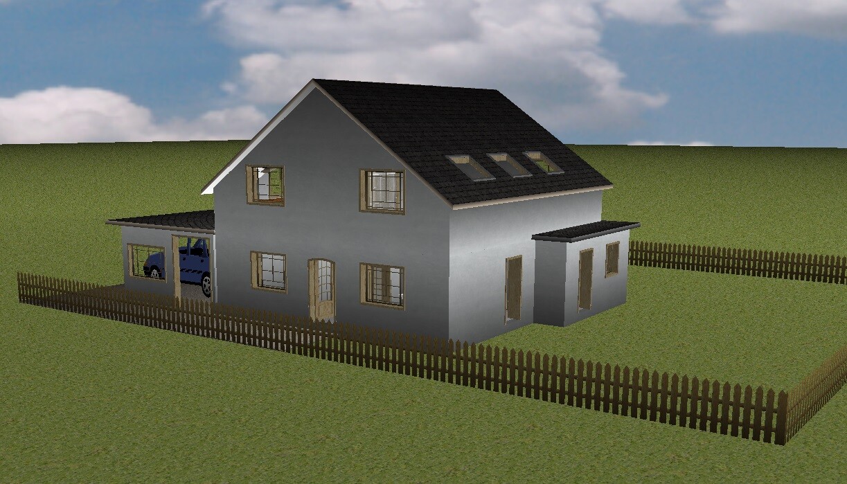 Vielleicht sollte ich noch hinzufügen, dass wir 2 Vollgeschosse nicht so mögen, weil es so turmmäßig aussieht. Fallen jemandem Gestaltungsmöglichkeiten ein, um das zu umgehen?Ein 3-Giebelhaus finde ich auch immer sehr hübsch. Hier mal angedeutet. Aber bitte immer dran denken, dass mein Programm uralt ist und Ihr Eure Phantasie mit einsetzen müsst.Das Carport ist sehr hoch, da ja dieser Bus da drunter soll. Alternativ mal noch ein anderes mit normaler Höhe dargestellt.