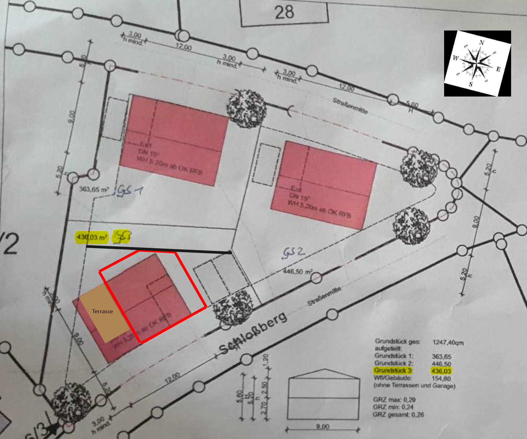 Im Lageplan ist das im Raster größtmögliche Haus rot eingezeichnet. Wir werden etwas "kürzer sein".