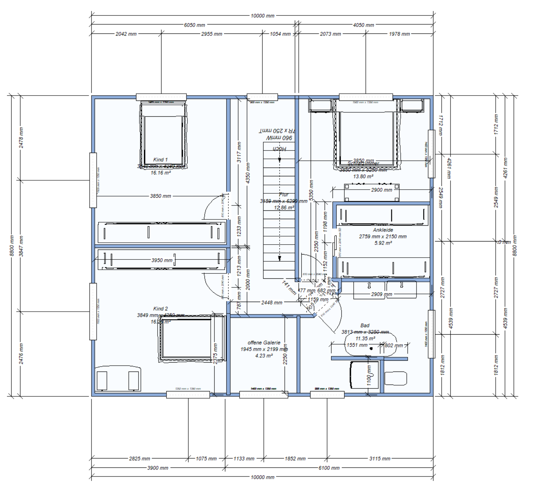 In den Skizzen sind noch 2 dabei, die eine Galerie enthalten. Das werden wir lassen - nur wie dann den gewonnen Raum nutzen außer für eine Ankleide (wohl ohne Fenster)? Da wir sowieso wenige qm² haben, wollen wir diese 4qm² nicht auch "verlieren" - aber effizient nutzen lässt es sich nicht. Habt Ihr da eine Idee?