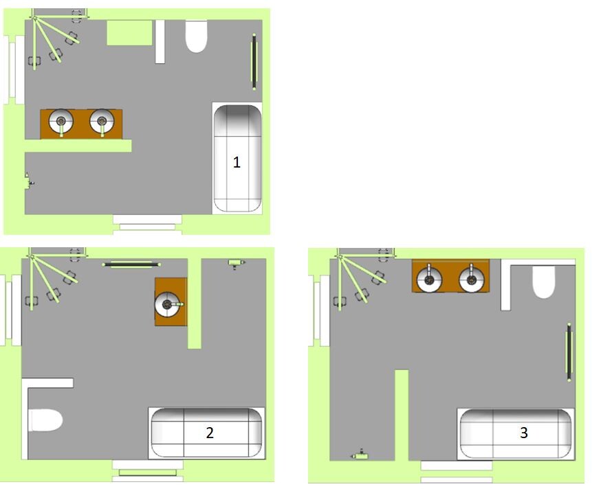 Drei Badezimmer-Grundrisse mit Dusche, Badewanne, Toilette und Doppelwaschbecken.