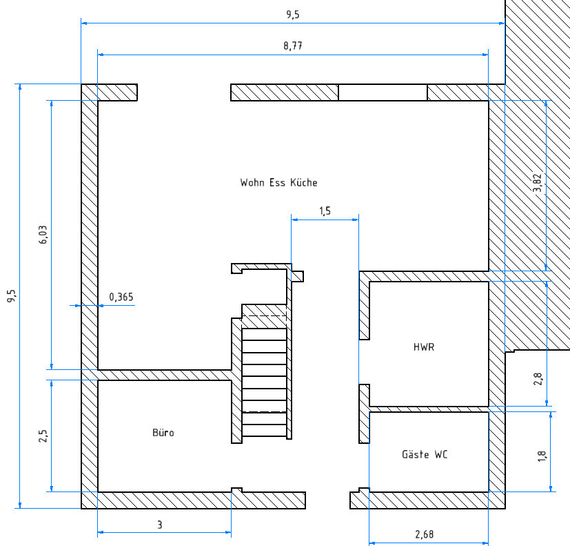 Die viele Herumlauflänge ergibt sich aus dem Typus einläufige gerade Treppe, der für diese Hausgröße ungeeignet ist.