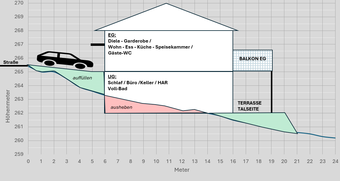 Wir möchten mit 2 Vollgeschossen bauen und aufgrund der Hanglage wird das UG zum Hang teilunterkellert sein, auch um einen "Kellerbereich" zu haben. Das UG wird zum Tal hin mit Schlaf-/Büroräumen belegt, um auch die Talseite sinnvoll zu nutzen und die Möglichkeit zu haben, die Terrasse über das Büro zu nutzen. "Hauptterrasse" wird allerdings der Balkon im EG.