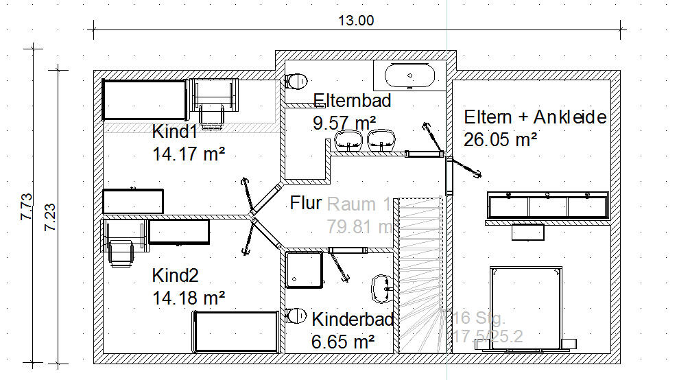 So auf die Schnelle aus einem Haus, was eigentlich für maximal 1 Kind gedacht war, ein anderes Haus mit eurem Anforderungsprofil zu machen, ist halt nicht so einfach, da es zwischen den Geschossen, den Treppenlagen, den Gaubenlagen usw. zu viele Abhängigkeiten gibt.