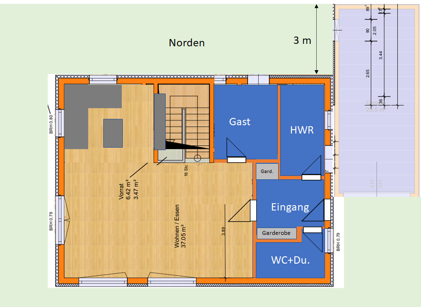 So meinte ich das, dafür müsste die Garage weder kürzer werden noch das Haus weiter als 3m von der Nordgrenze weg. Und die Zuwegung müsstest du auch nicht extra pflastern, sondern gehst quasi auf der Einfahrt zur Haustür. So würde wohl auch ein etwas größeres WC inkl. Dusche hinpassen.