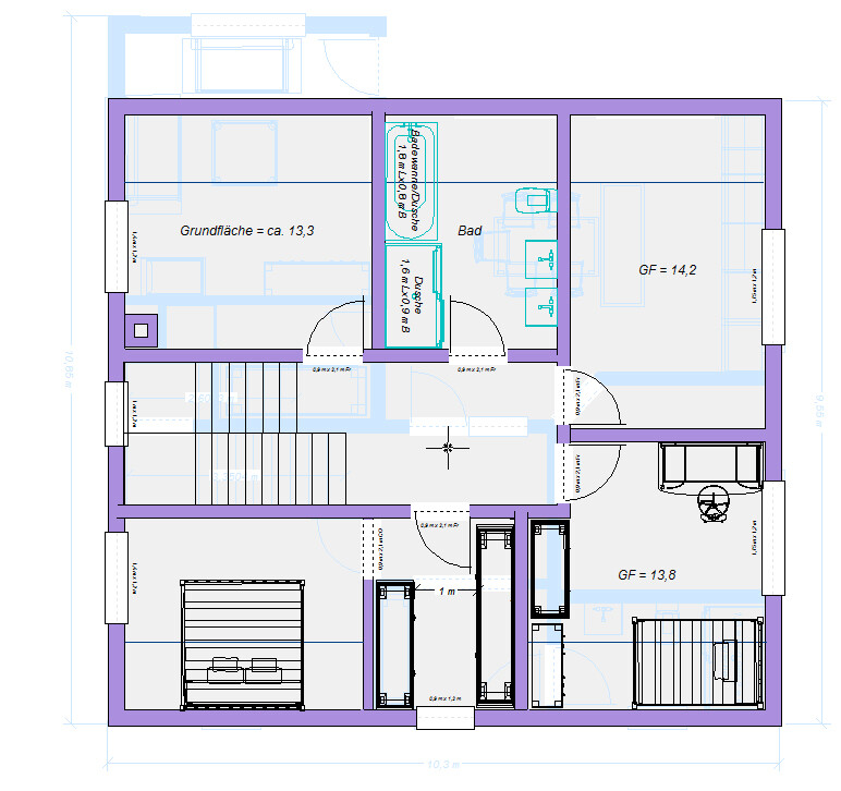 Im OG: Der sowieso nicht gerade geeignete Schrankecke fällt weg, dafür generiert sich neuer und größerer Stauraum im OG, da die Treppen übereinander liegen können.