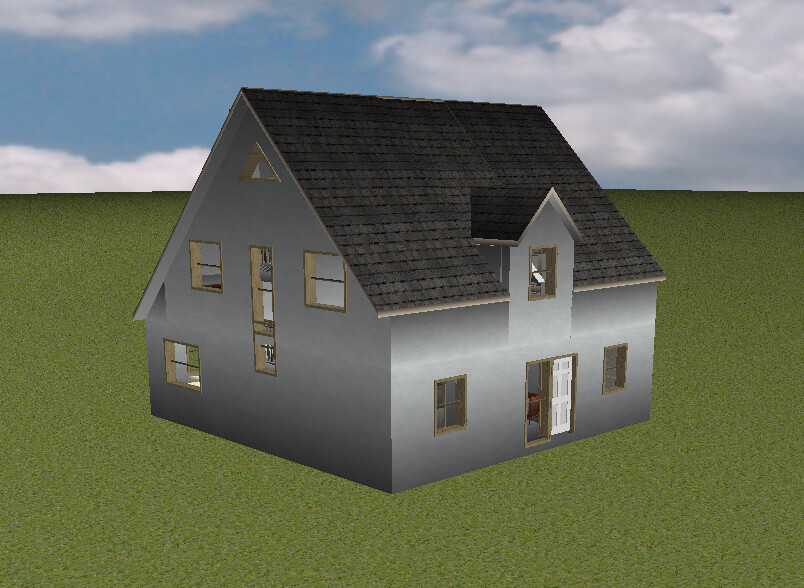 3D-Render eines grauen Hauses mit dunklem Dach, vielen Fenstern und offener Tür auf Gras.