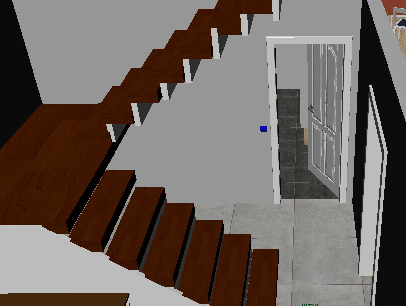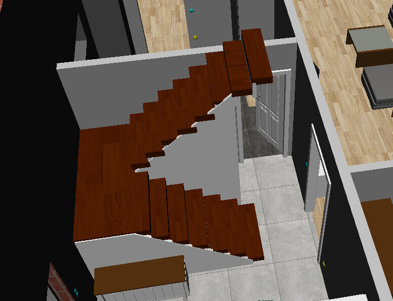 WIr haben das gerade mal versucht zu visualisieren. Wenn wir es korrekt umgesetzt haben, wird der Raum zwischen Treppe und Wohnzimmer sehr eng. (80 cm zwischen Stufe und Wand zum Wohnzimmer) Das Podest oben braucht doch auch die Breite einer normalen Stufe, oder?