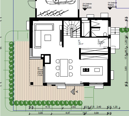 Inselküche lässt sich realisieren indem ihr das Esszimmer etwas nach links schiebt und dadurch zwar an Überdachung verliert, aber Platz für die Insel gewinnt.