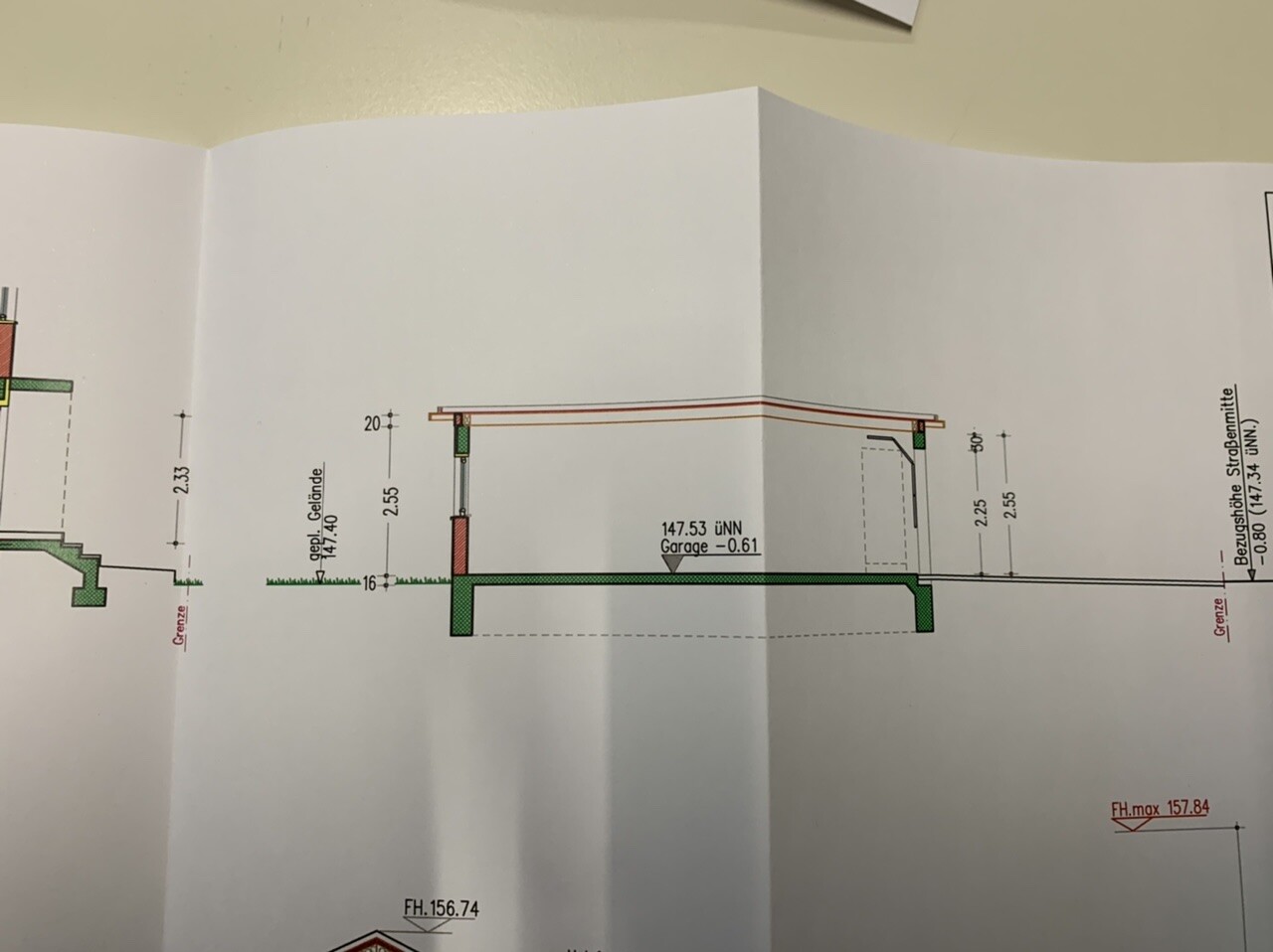Technische Zeichnung eines Garagen-Schnitts mit Fundamenten, Bodenlinie und Maßangaben.
