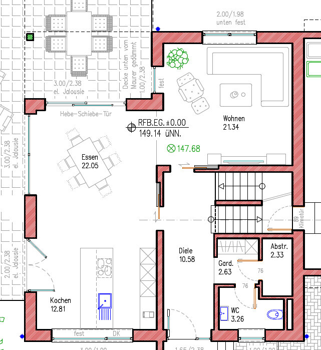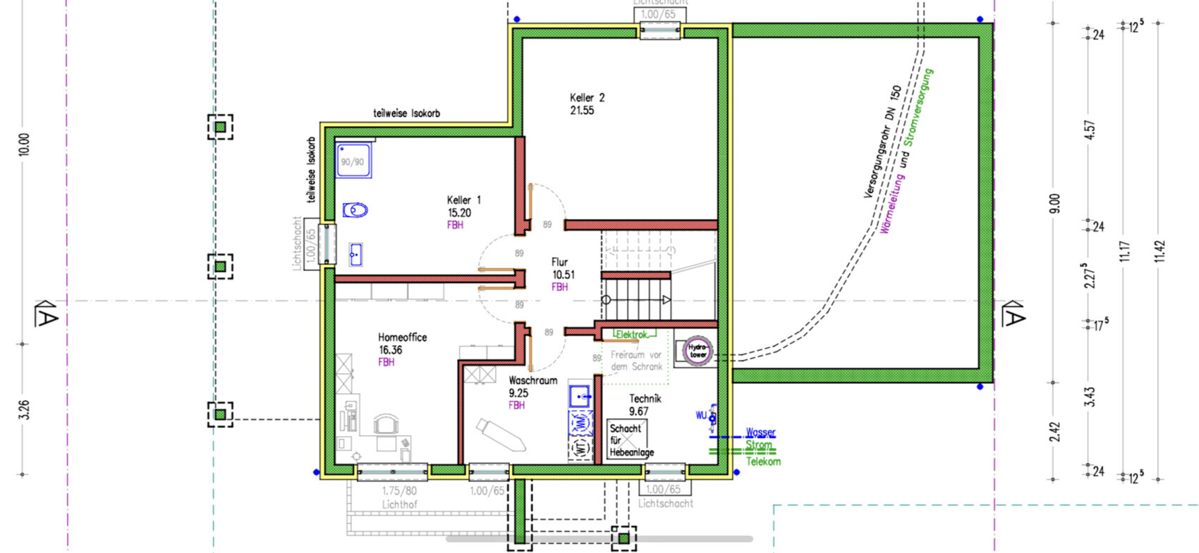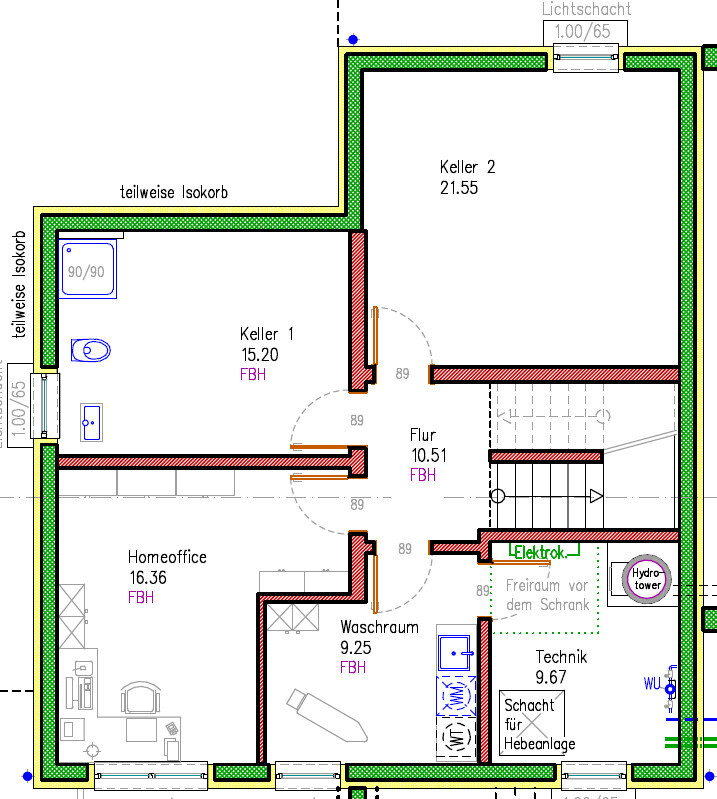 Außerdem wäre es hier und jetzt schon wichtig, da Du die tragenden Elemente brauchst. ich sag mal: ist erst mal das EG optimiert, muss sich der Keller dem unterordnen.Das Dusch-WC im Keller ist direkt neben dem Home-Office geplant.