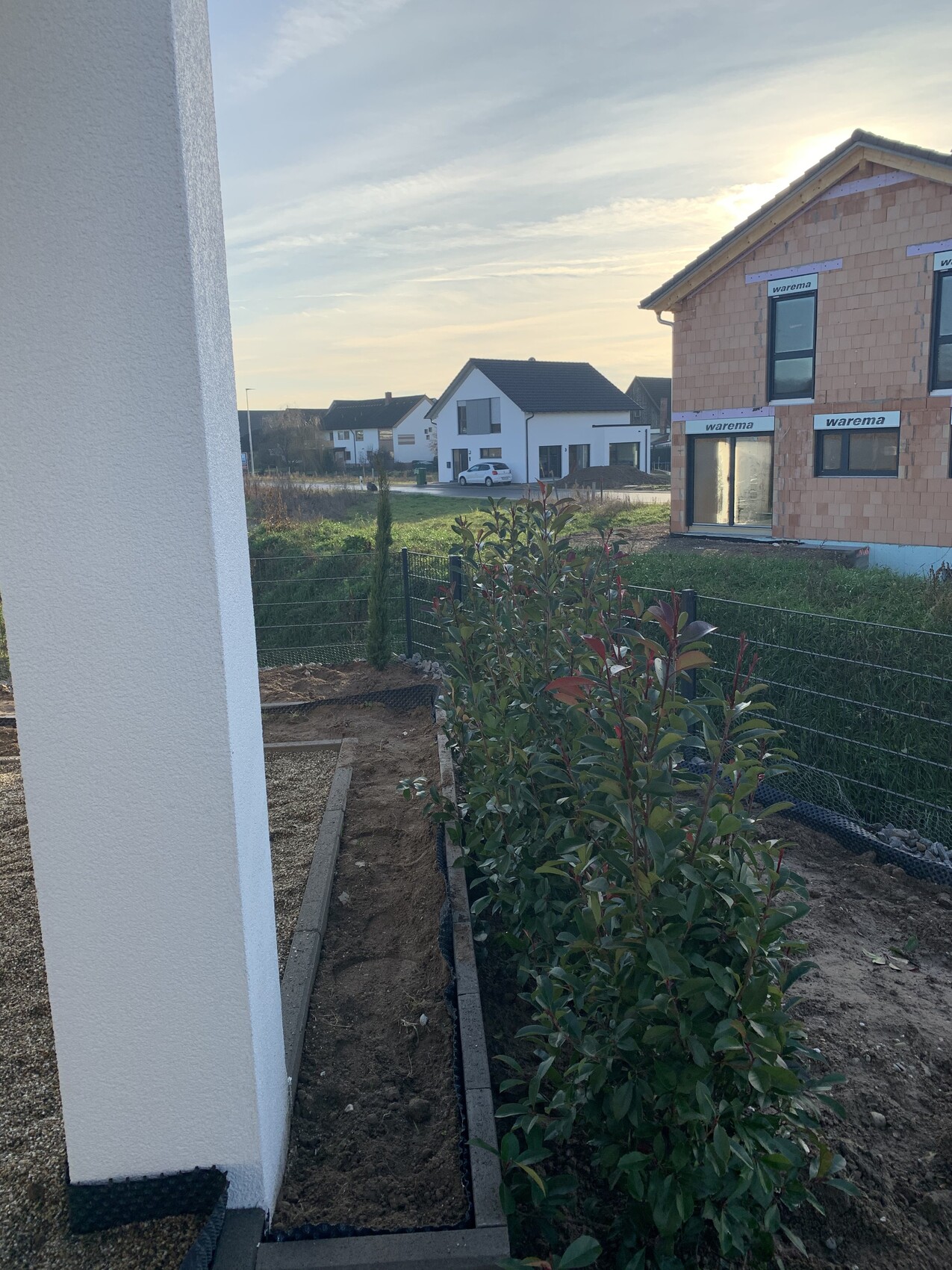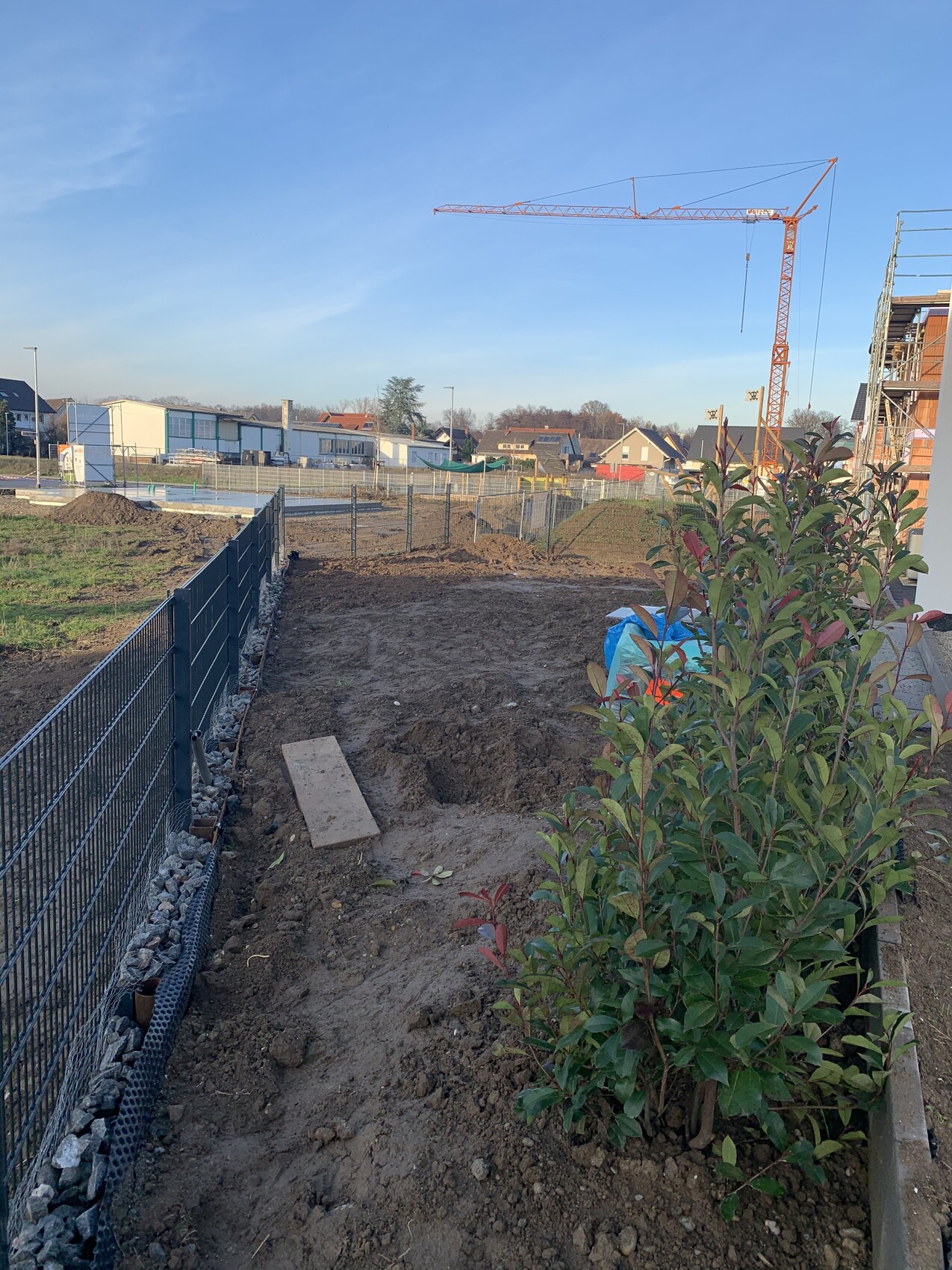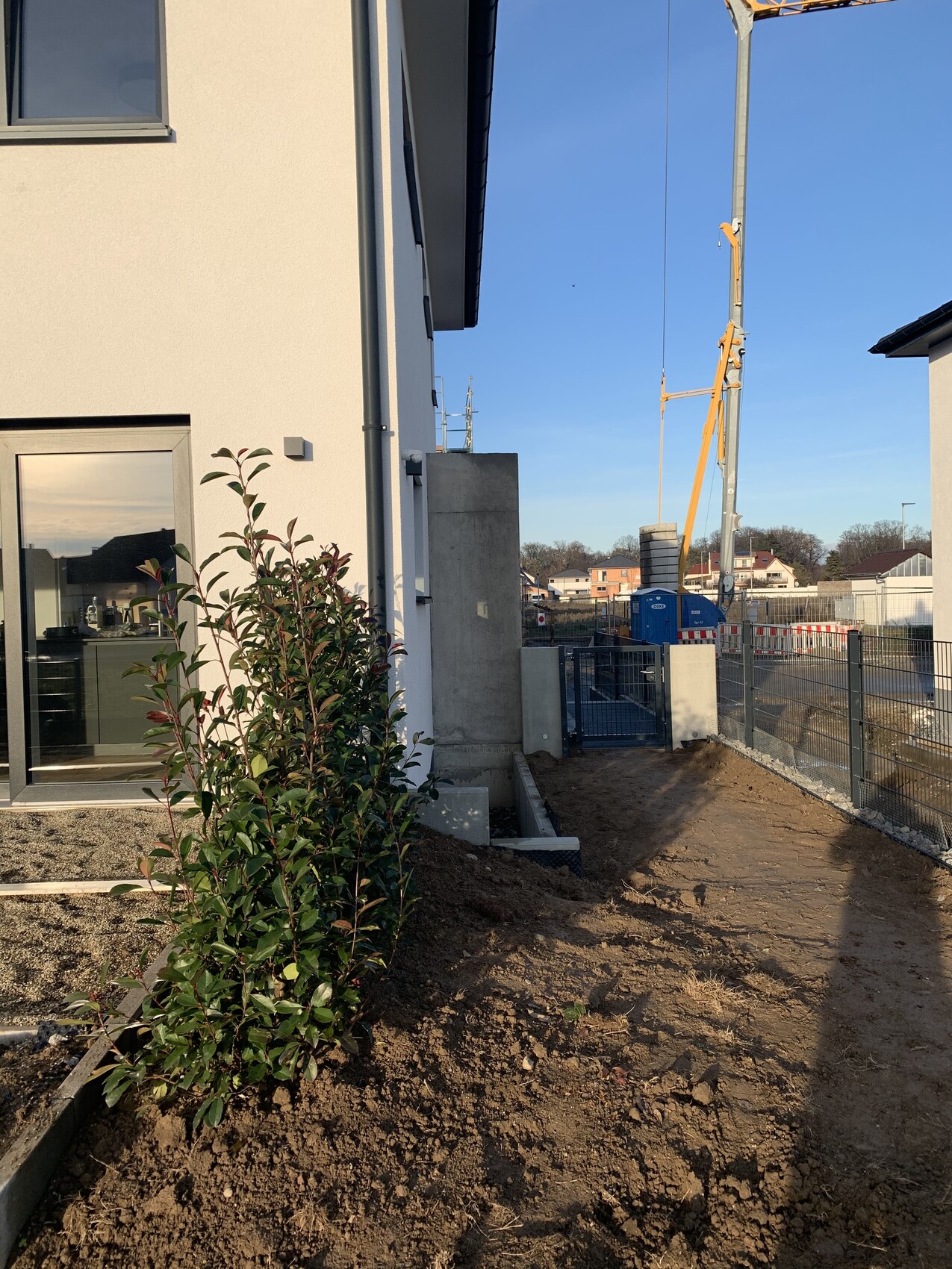 Neubau neben Wohnhaus; Vordergrund Busch, unbefestigte Erde, Zaun, Kran im Hintergrund.