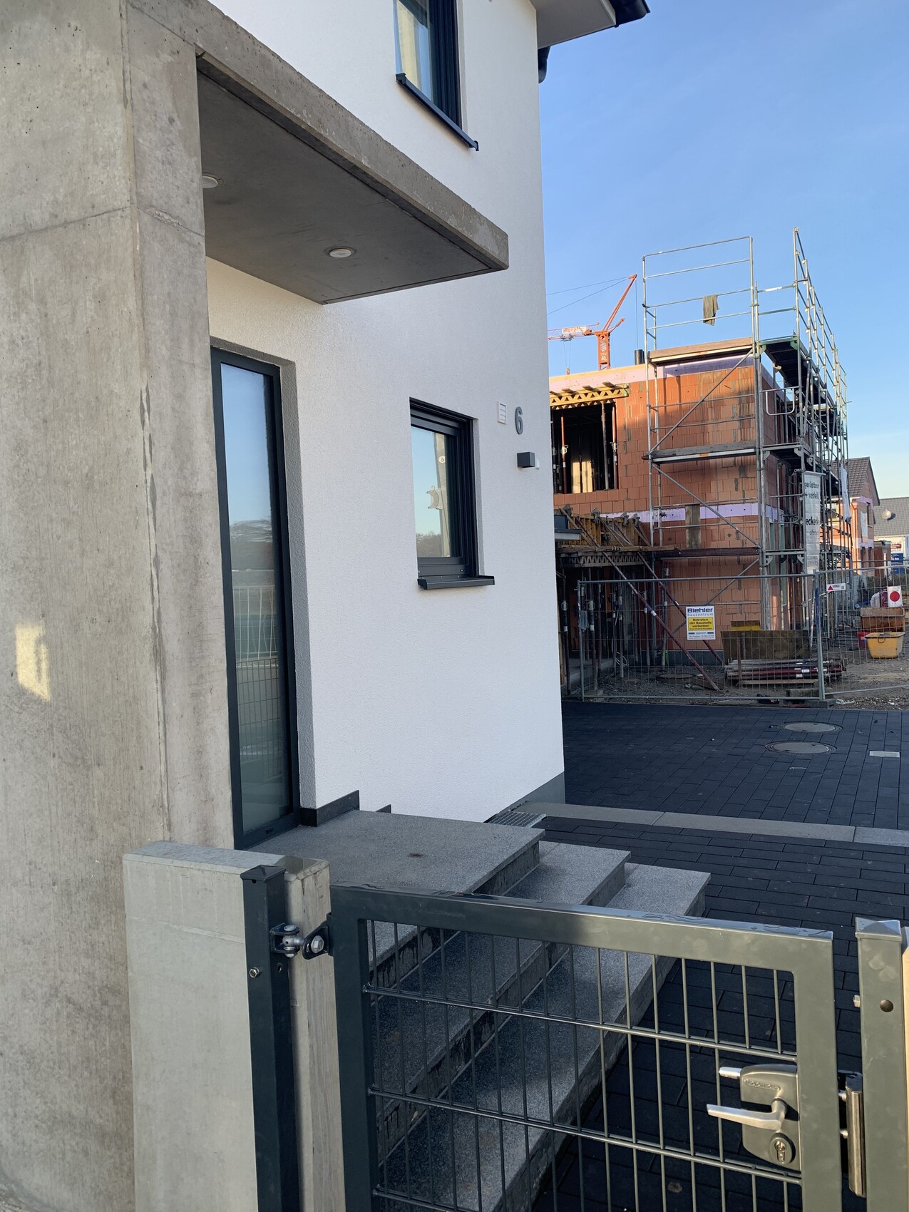 Außenansicht einer Baustelle: weiße Fassade, Fenster, Kiesstreifen neben Fundament, Metalltor im Hintergrund